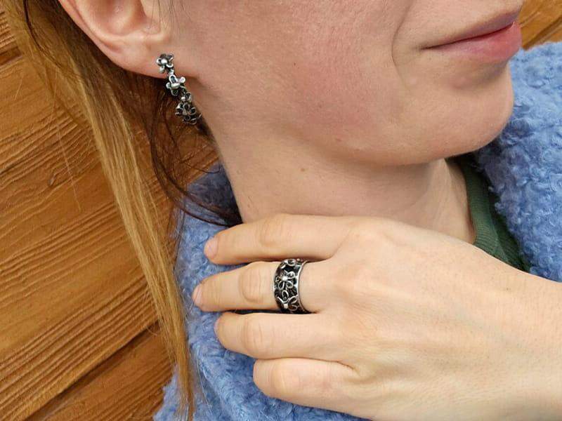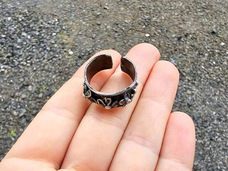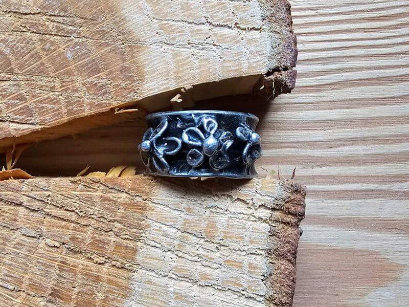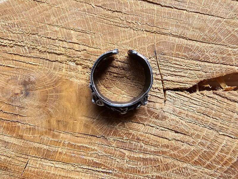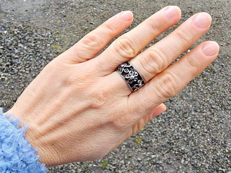 Pierścionek w formie obrączki z kwiatowym wzorem. Biżuteria wykonana jest techniką metaloplastyki.