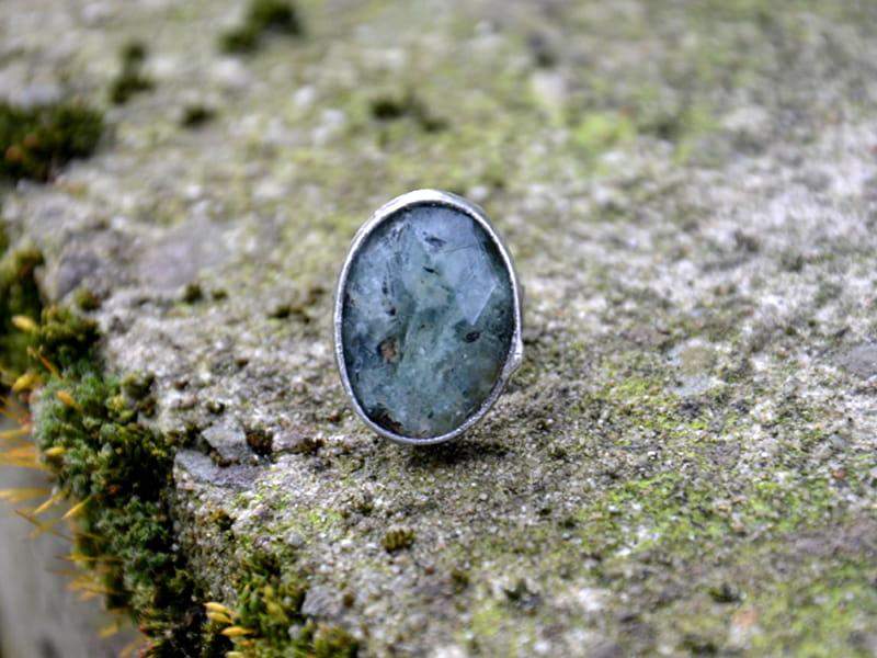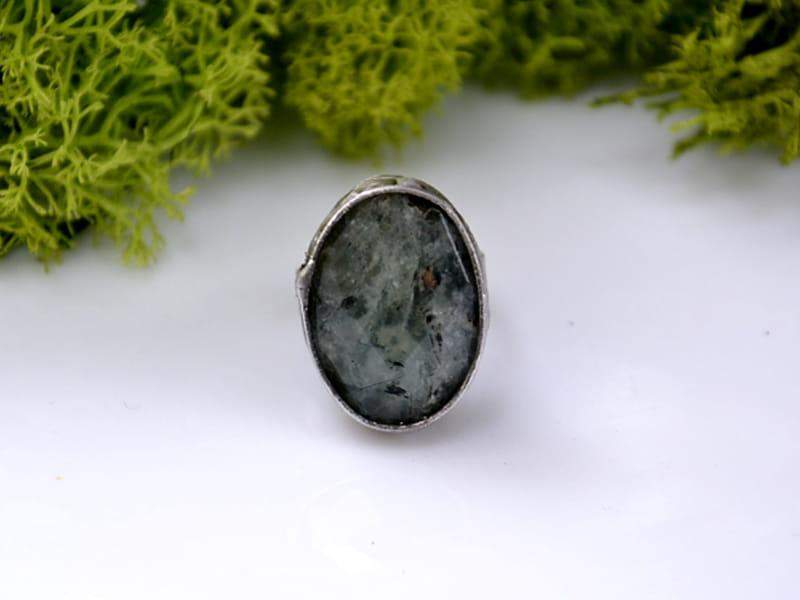 Unikatowy pierścionek z fasetowanym jadeitem. Wymiary kamienia to 2,5 x 1,5 cm. Oprawa wykonana z miedzi pokrytej ekologiczną cyną stylizowaną na stare srebro. Obrączka regulowana. Biżuteria w 100% wykonana ręcznie, poszczególne sztuki mogą się minimalnie różnić.