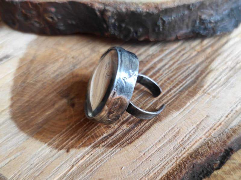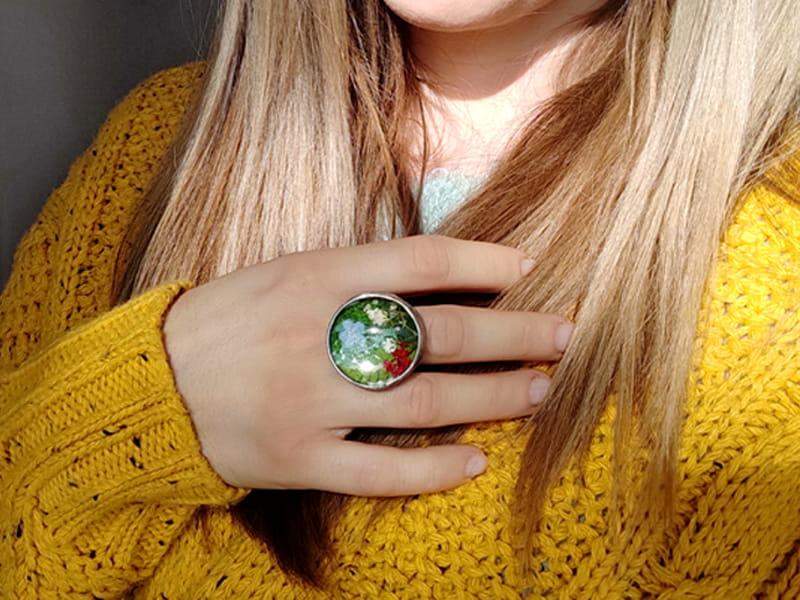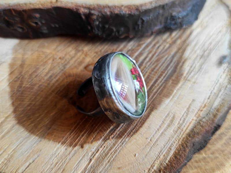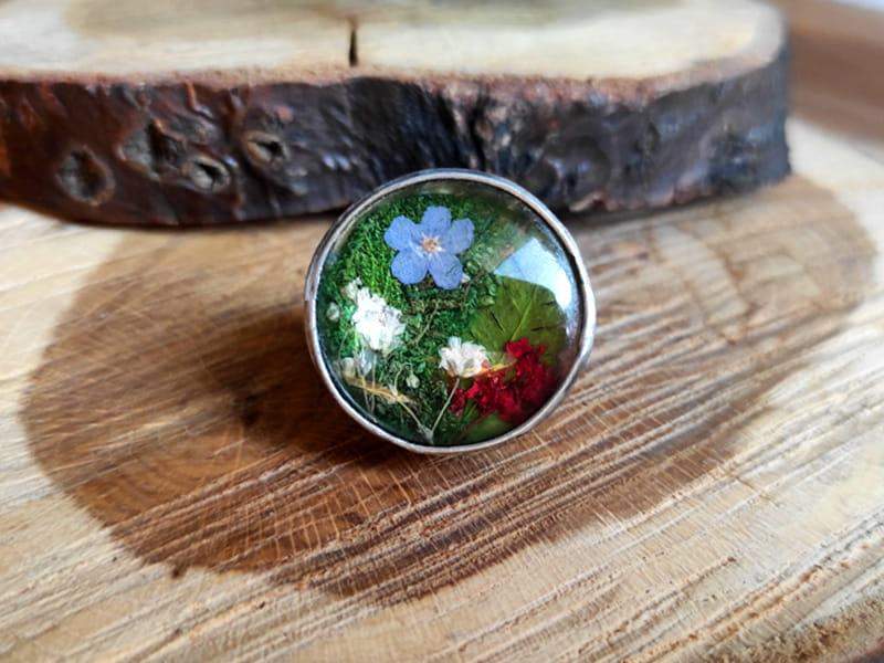Romantyczny regulowany pierścionek z mchem, paprocią i kwiatami zamkniętymi w okrągłym, wypukłym szkle, otulonym rustykalną oprawą. Pierścionek stworzony dla nietuzinkowych kobiet. Jeśli kochasz oryginalny, niepowtarzalny styl, będzie dla Ciebie idealnym dodatkiem.