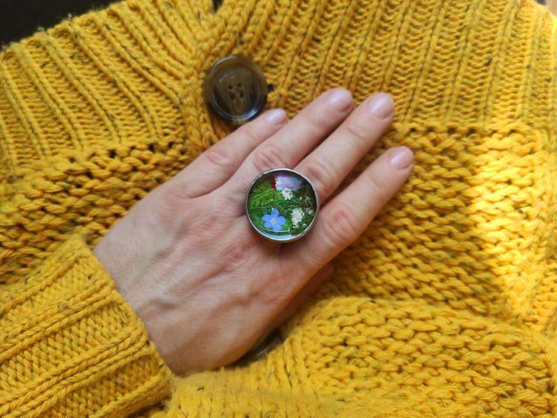 Romantyczny regulowany pierścionek z mchem, paprocią i kwiatami zamkniętymi w okrągłym, wypukłym szkle, otulonym rustykalną oprawą.