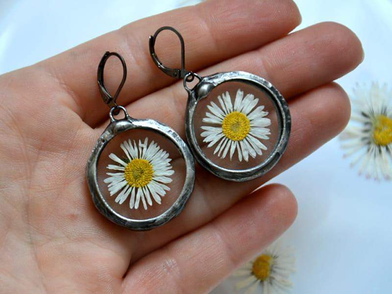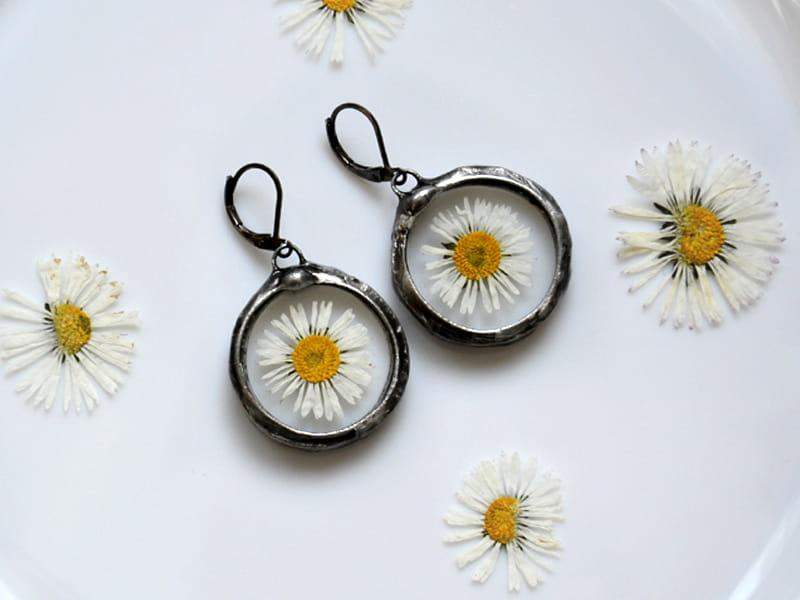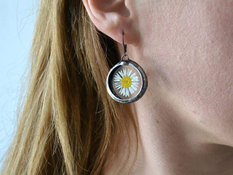 Urocze kolczyki ze stokrotkami zamkniętymi w szkle. Oprawa w kolorze starego srebra. Zamykane bigle. Długość kolczyka to ok. 4 cm. Biżuteria w 100% wykonana ręcznie, poszczególne sztuki mogą się minimalnie różnić.
