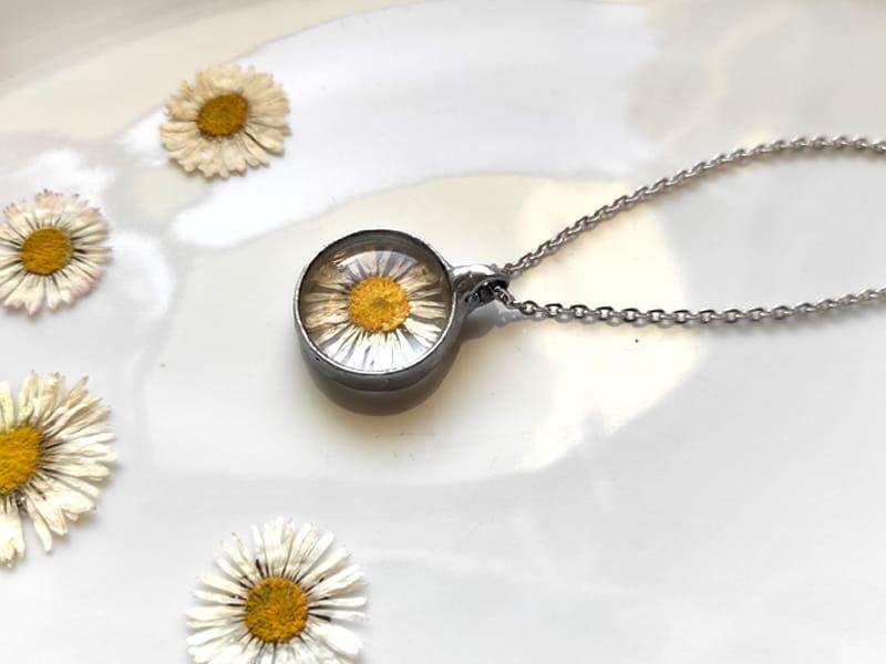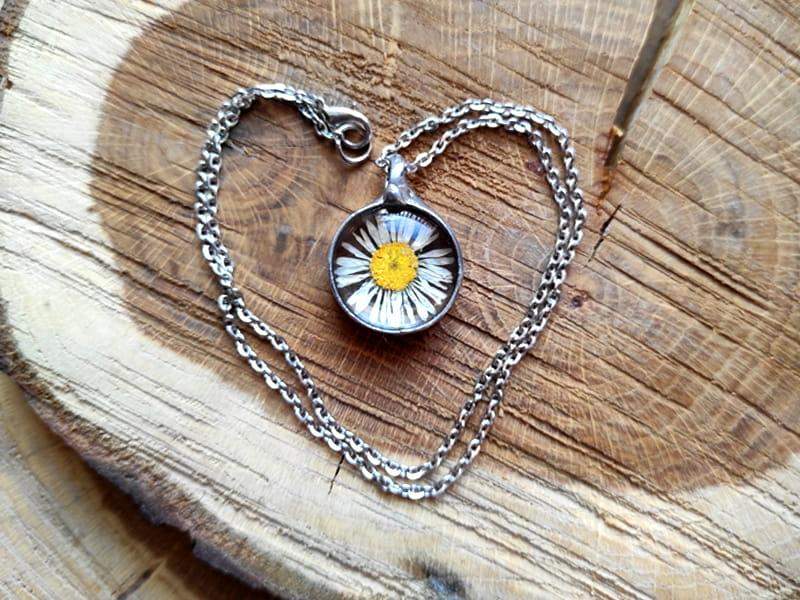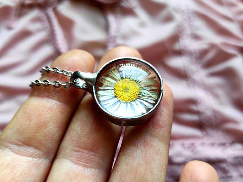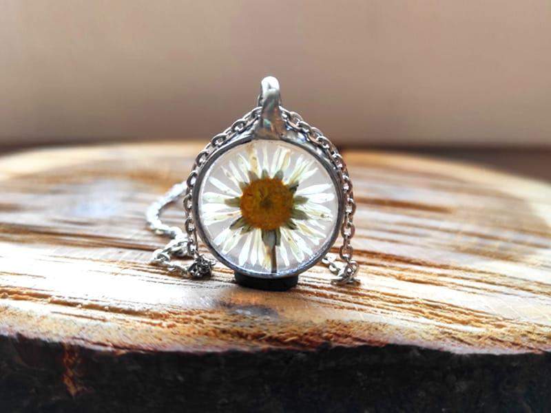 Delikatny naszyjnik ze stokrotką zamkniętą w szkle.