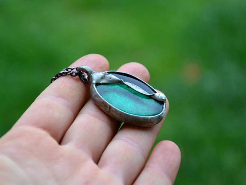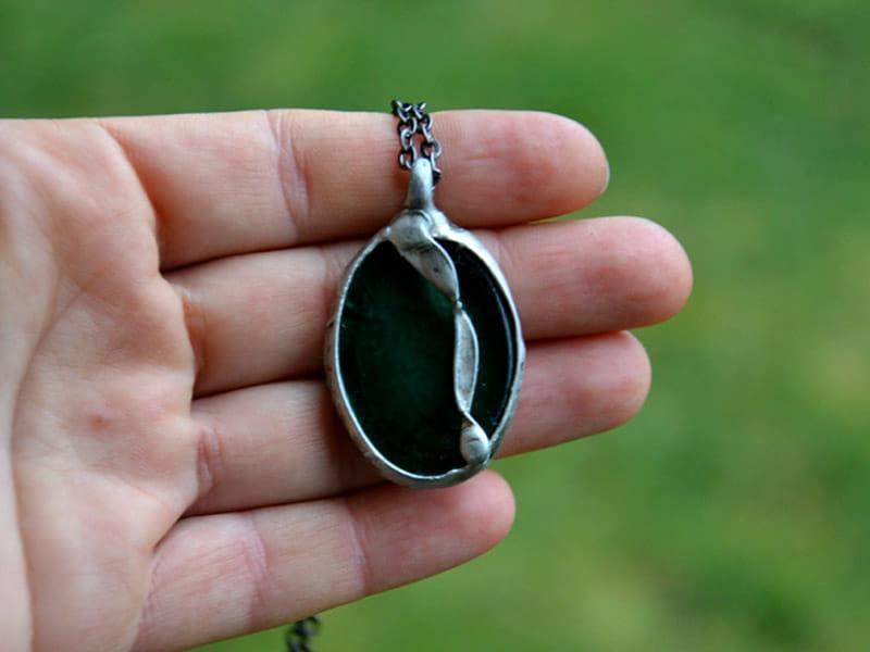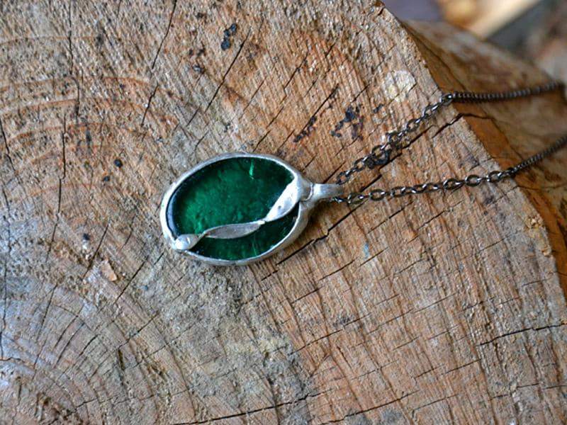 Dekoracyjny naszyjnik z wytopionym szkiełkiem w interesującym odcieniu zieleni, oprawionym w ekologiczną cynę stylizowaną na stare srebro. Wymiary wisiora to ok. 2,5 x 4 cm. W komplecie długi łańcuszek. Biżuteria w 100% wykonana ręcznie, poszczególne sztuki mogą się minimalnie różnić.