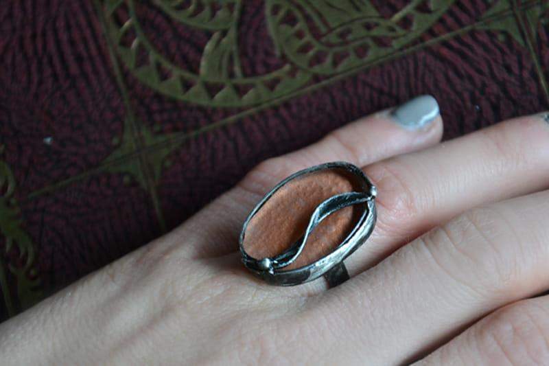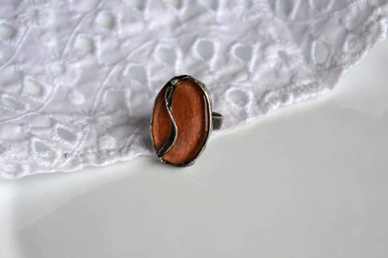 Romantyczny pierścionek ze stapianym szkłem w kolorze miedzianym.