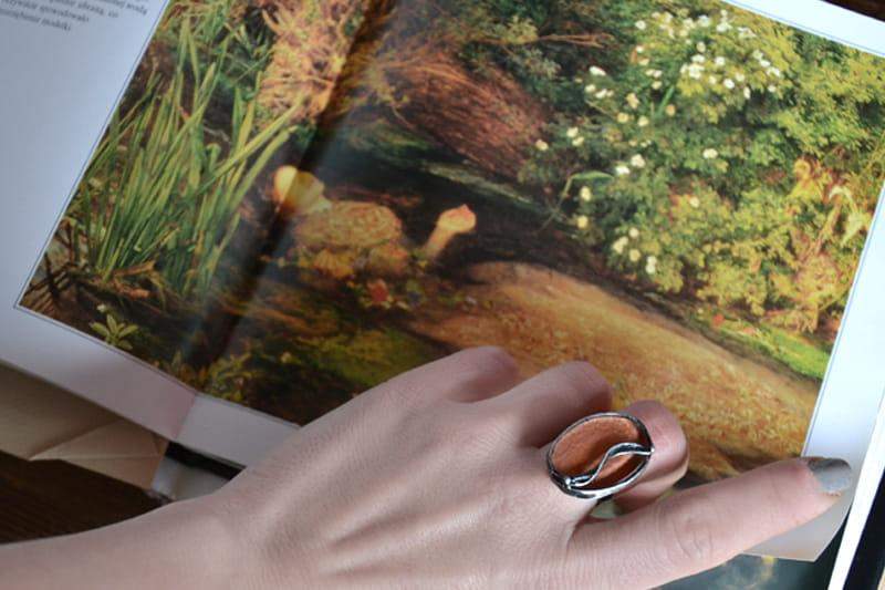 Romantyczny pierścionek ze stapianym szkłem w kolorze miedzianym. Szkło wraz z oprawą ma wymiary ok. 2 cm x 3 cm. Szkło oprawione jest w ekologiczną cynę stylizowaną na stare srebro. Obrączka regulowana. Biżuteria w 100% wykonana ręcznie, poszczególne sztuki mogą się nieznacznie różnić.