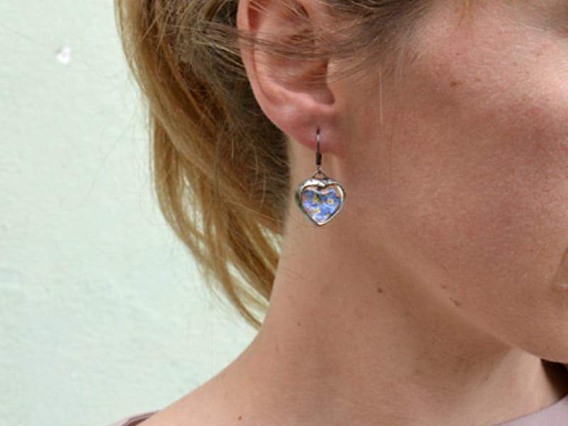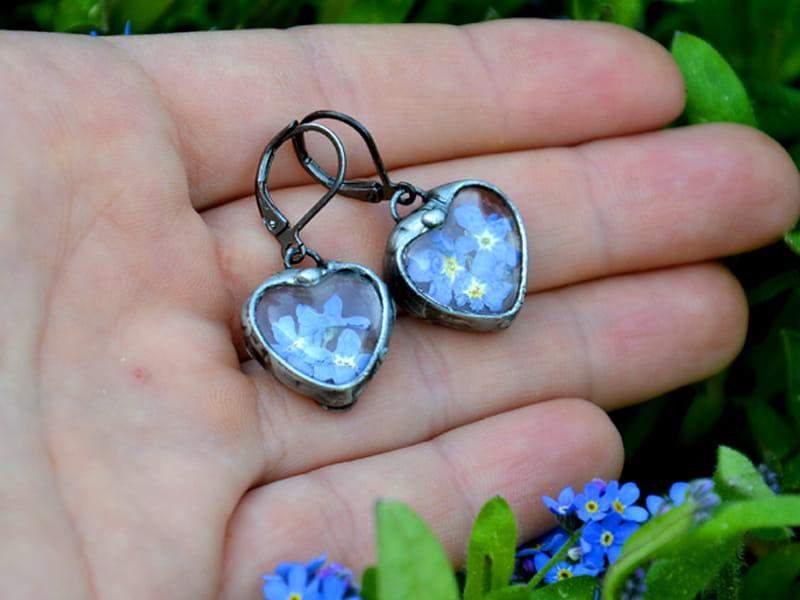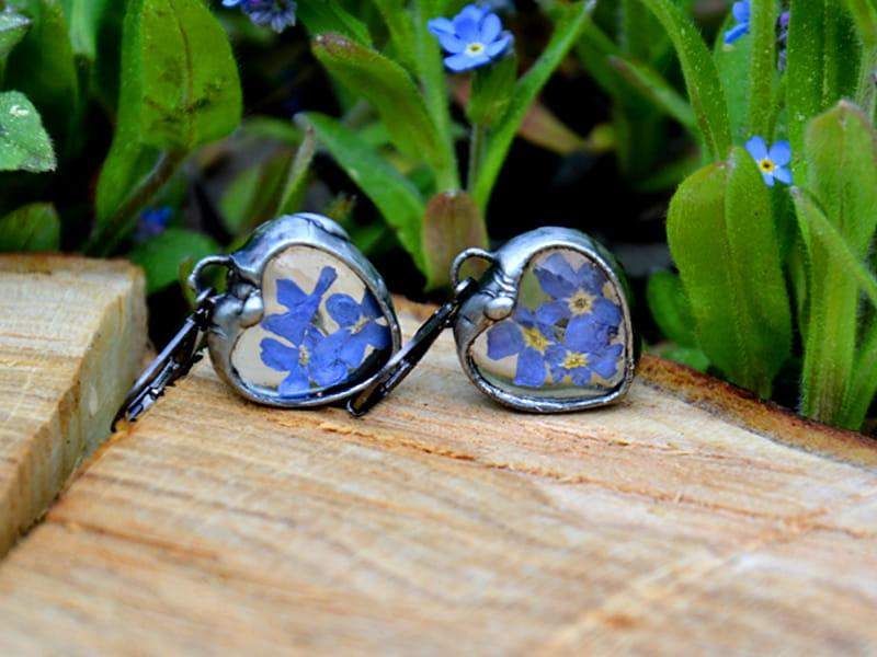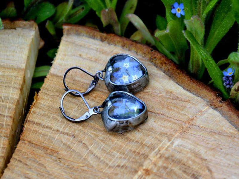 Romantyczne kolczyki z niezapominajkami zamkniętymi w szkle. Oprawa wykonana z ekologicznej cyny w kolorze starego srebra. Zamykane antyalergiczne bigle. Długość kolczyka to ok. 3,5 cm. Biżuteria w 100% wykonana ręcznie, poszczególne sztuki mogą się minimalnie różnić.