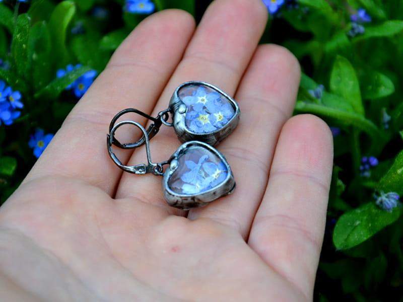 Romantyczne kolczyki z niezapominajkami zamkniętymi w szkle.