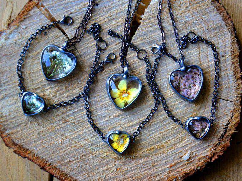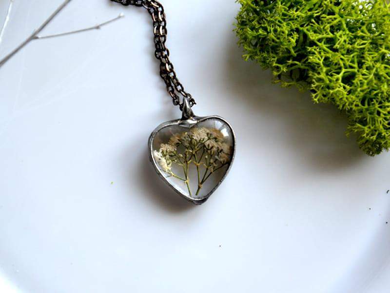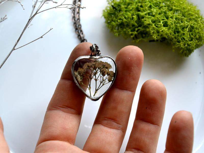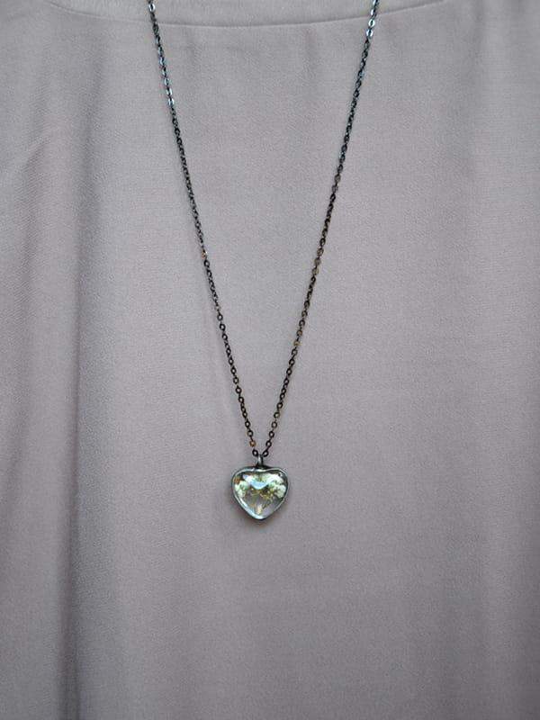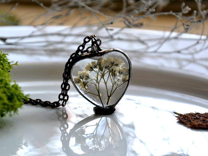 Delikatny, romantyczny naszyjnik z białymi kwiatuszkami zamkniętymi w szklanym serduszku.
