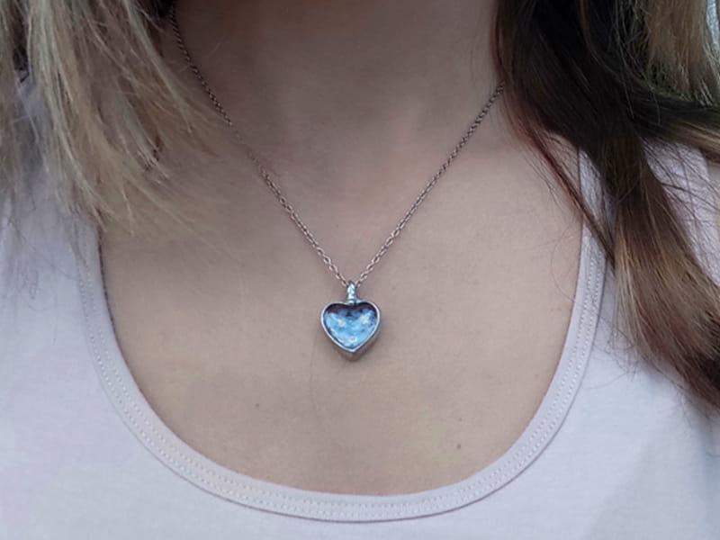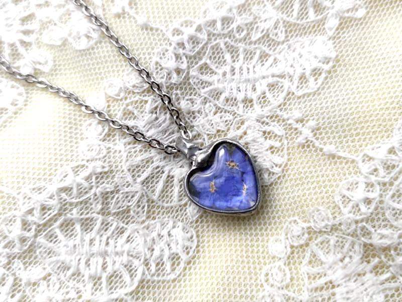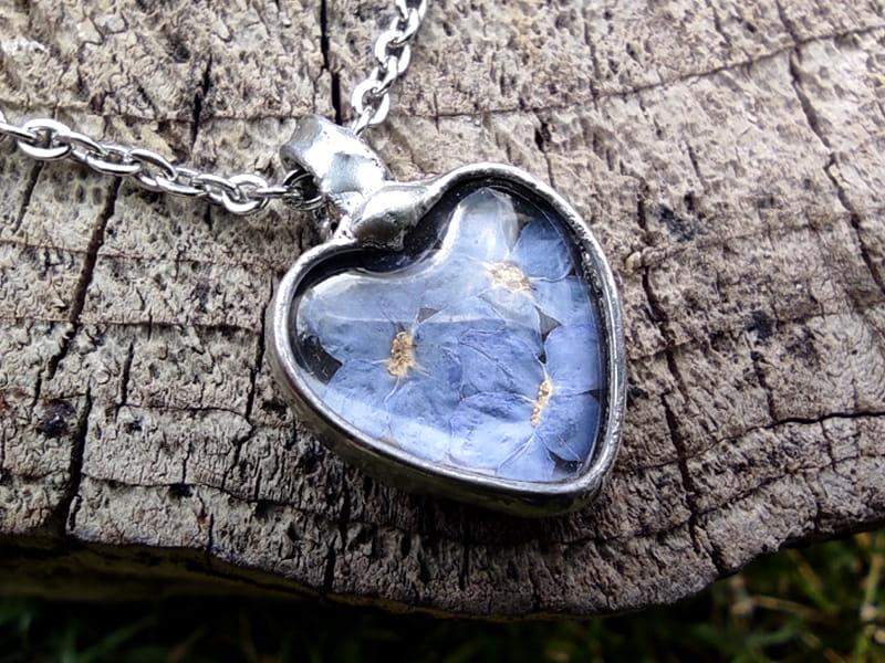 Romantyczny naszyjnik z zamkniętymi w szkle niezapominajkami.