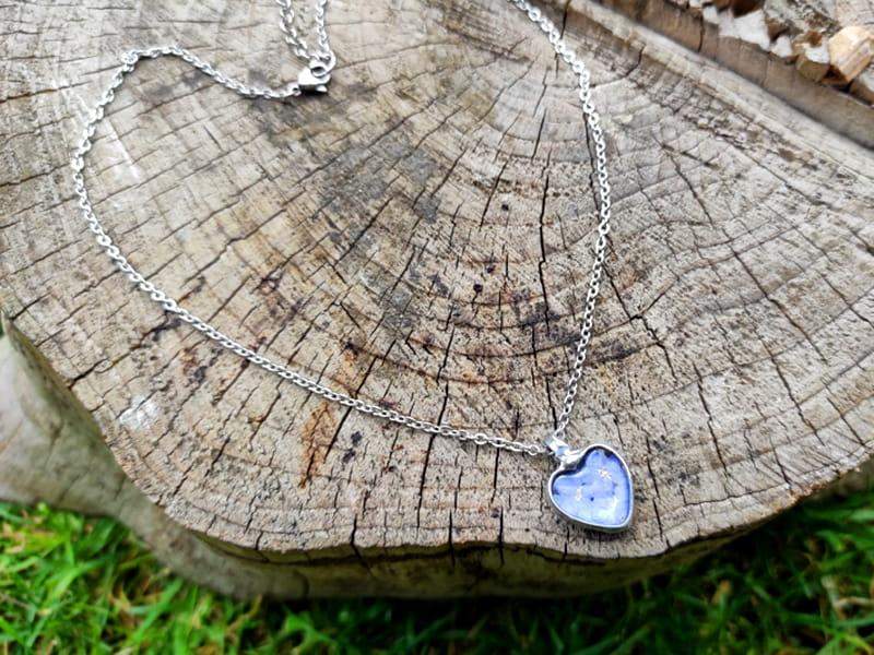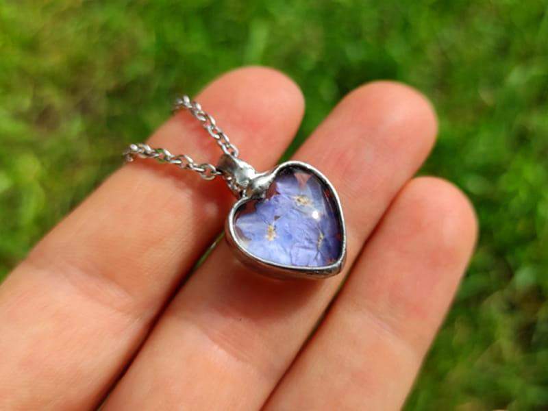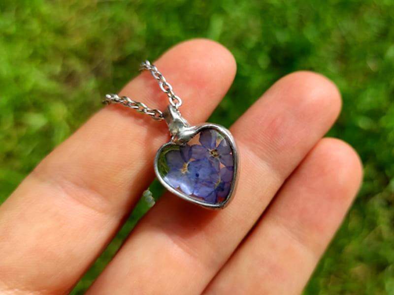 Romantyczny naszyjnik z niezapominajkami zamkniętymi w szklanym serduszku. Naszyjnik inspirowany jest letnią, beskidzką łąką. Jeśli kochasz naturę, będzie idealnym dodatkiem do twoich stylizacji.