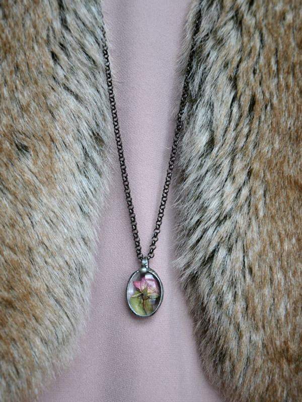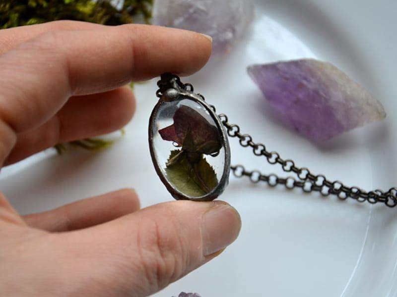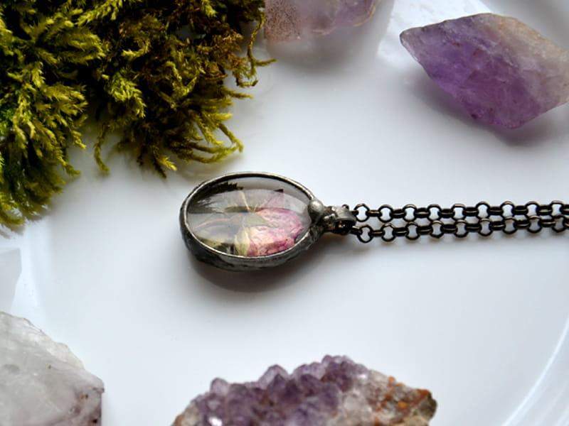 Delikatny, romantyczny naszyjnik z pączkiem róży zamkniętym w szkle.
