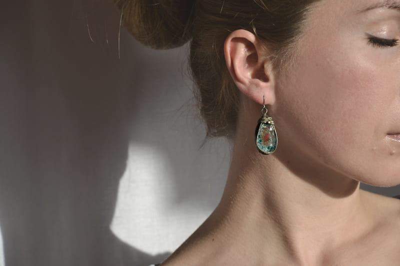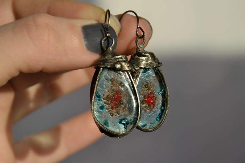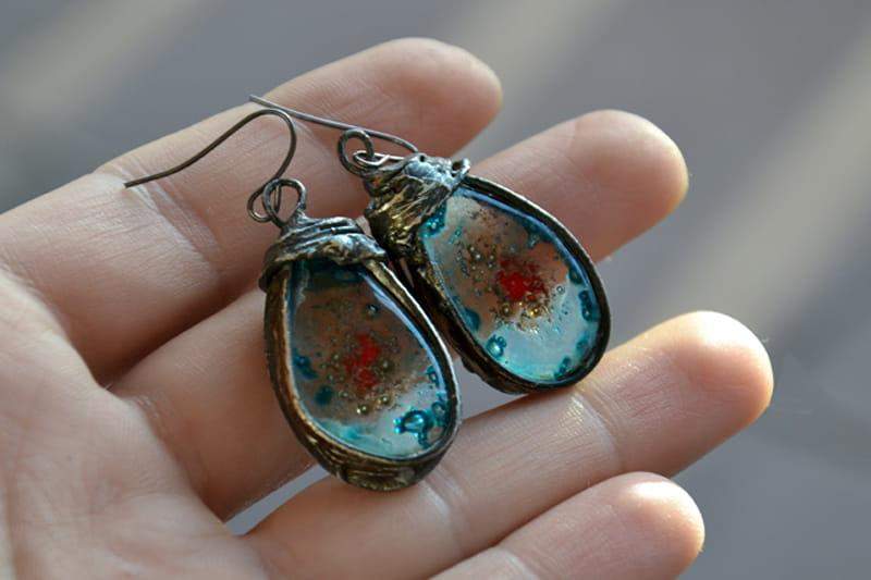 Kolczyki wykonane zostały metodą witrażową z wytopionego przez mnie szkła, miedzi i ekologicznej cyny. Oprawa stylizowana jest na kolor ciemnego srebra. Zamykane bigle wykonane są ze stali chirurgicznej.