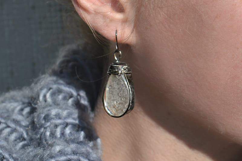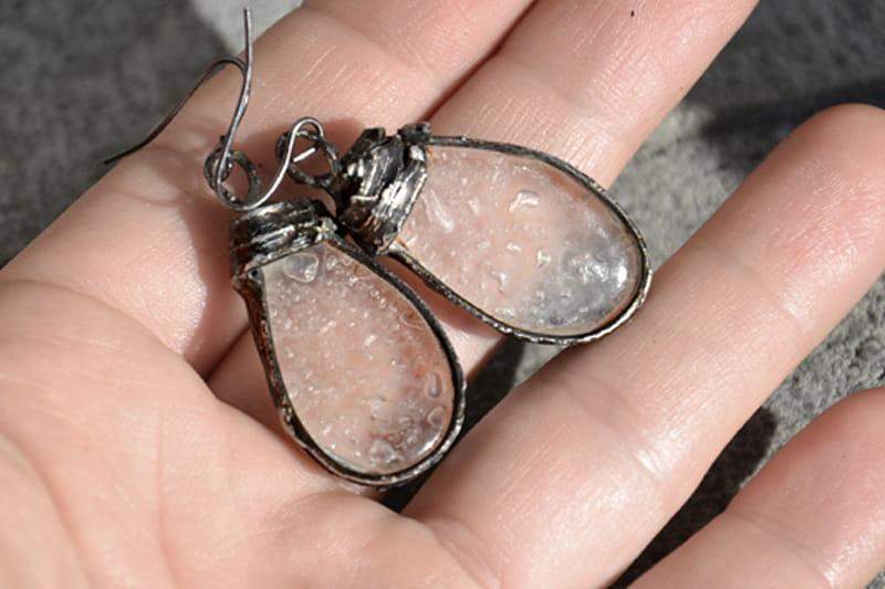 Niezwykłe, niepowtarzalne kolczyki ze szkłem pełnym białych bąbelków. Oprawa w kolorze starego srebra nadaje kolczykom uroku. Długość całego kolczyka to ok. 4,5 cm. Biżuteria w 100% wykonana ręcznie, poszczególne sztuki mogą się nieznacznie różnić.