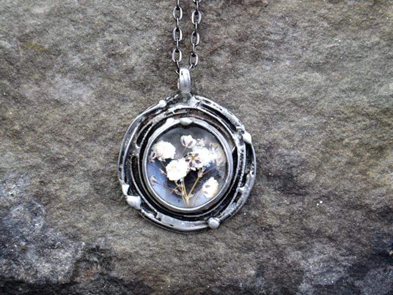 Wisior z zamkniętą w szkle gipsówką.