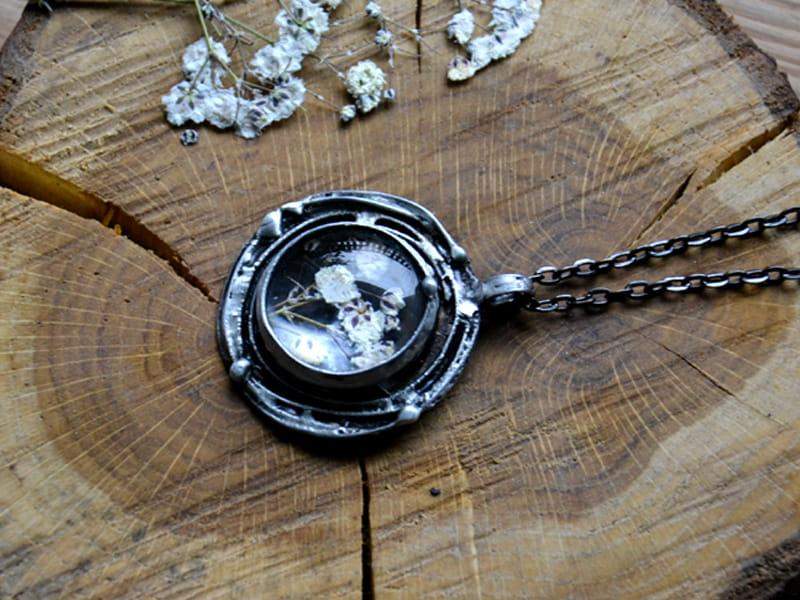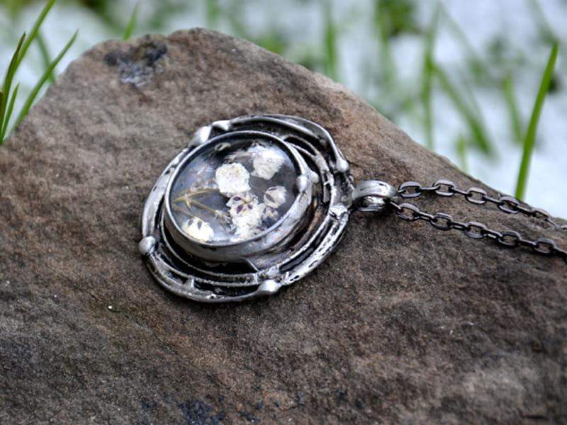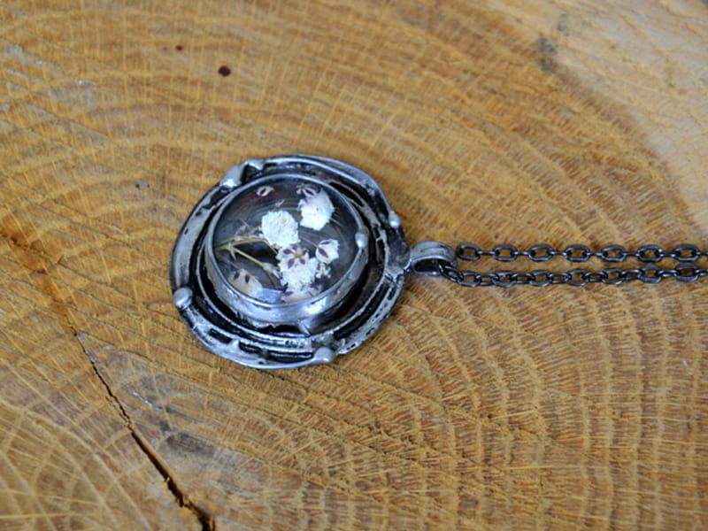 Wisior z zamkniętą w szkle gipsówką. Zawieszony na długim łańcuszku (standardowo 80cm). Całość stylizowana na stare srebro. Średnica zawieszki ok. 3,5 cm. Rustykalna oprawa wykonana z ekologicznej cyny. Biżuteria wykonana ręcznie, poszczególne egzemplarze mogą się nieznacznie różnić.