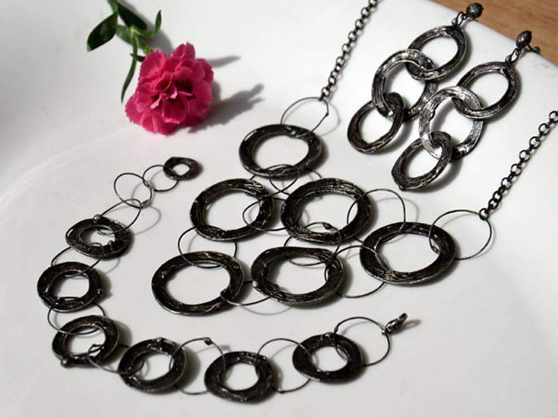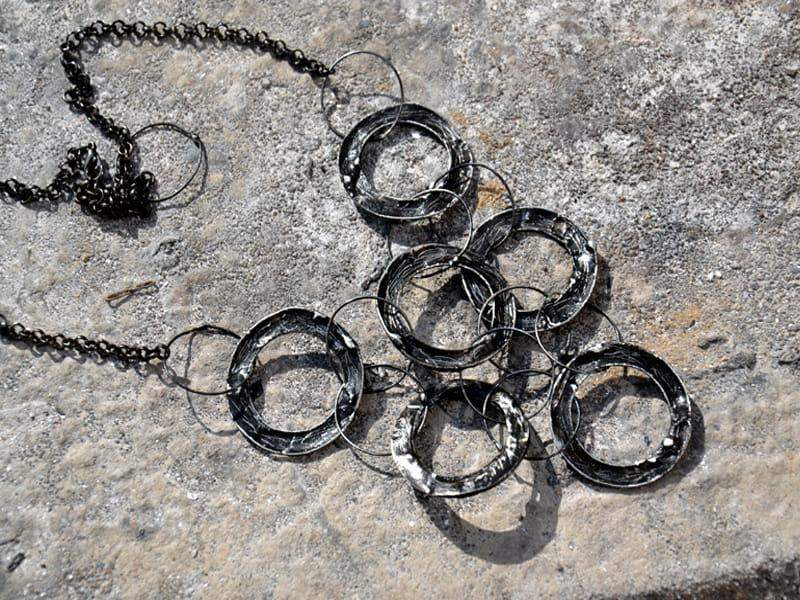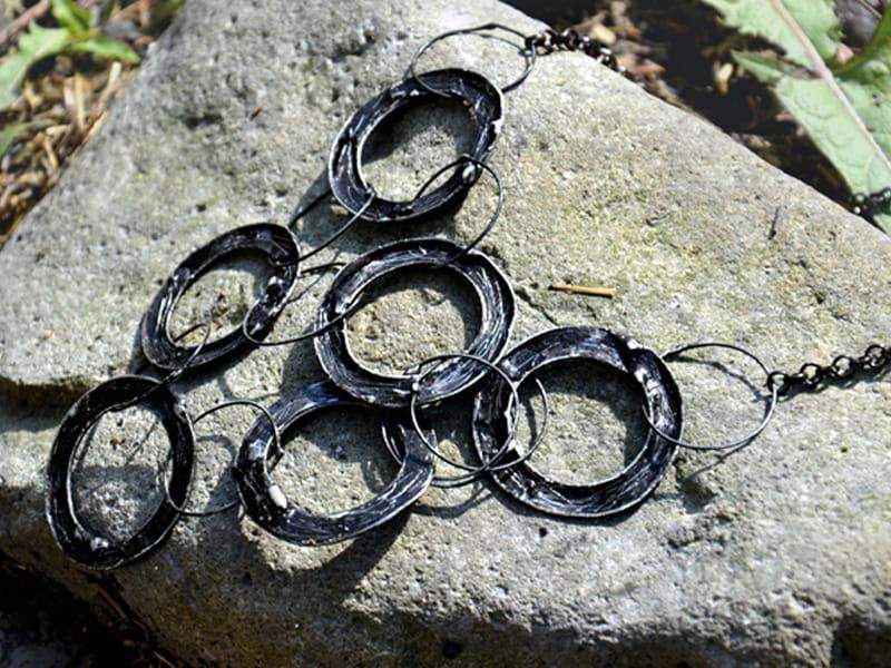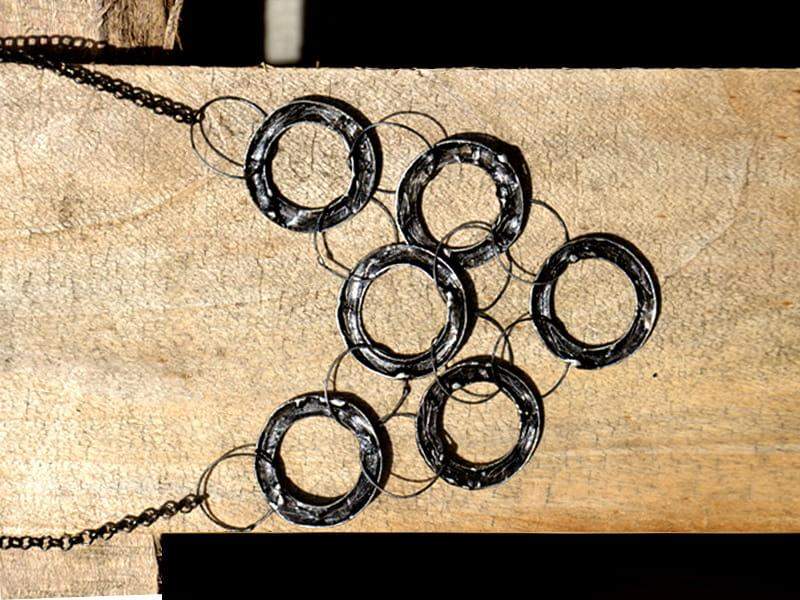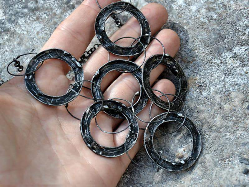 Rustykalny, efektowny naszyjnik z kaskadą kół wykonanych z miedzi pokrytej ekologiczną, bezołowiową cyną stylizowaną na ciemne srebro. Obwód kolii to ok. 50 cm + 5 cm regulacja (chętnie wykonam naszyjnik w każdym rozmiarze). Średnica pojedynczego koła to ok. 2,5 cm. Biżuteria w 100% wykonana ręcznie, poszczególne sztuki mogą się minimalnie różnić.