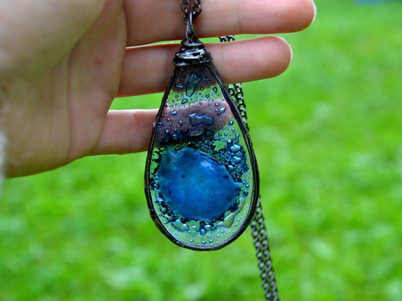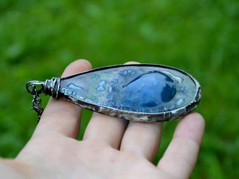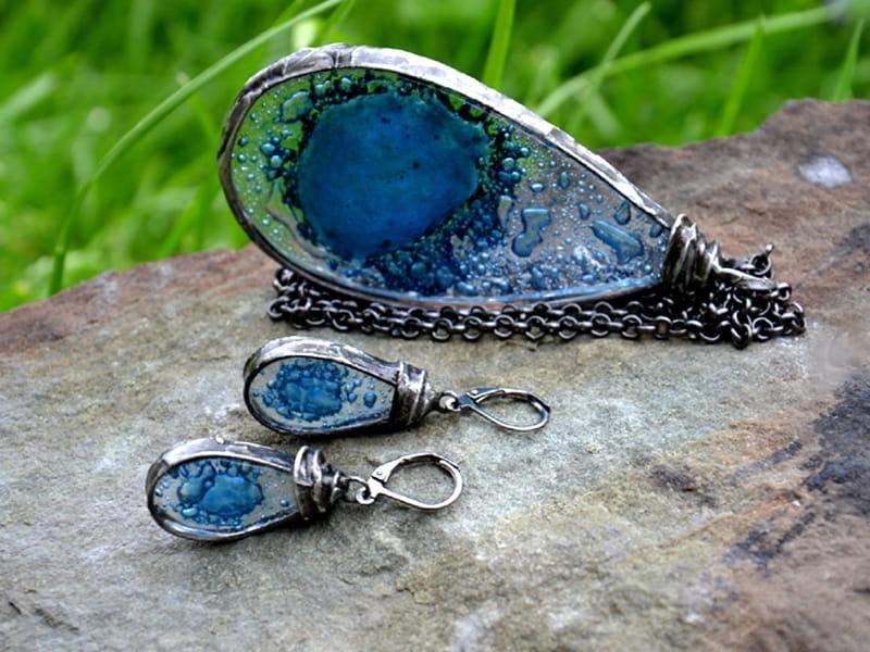 Efektowny, duży wisior ze szkłem pełnym bąbelków. Długość zawieszki to ok. 8 cm. Oprawa wisiora i długi łańcuch w kolorze starego srebra. Można również zakupić pasujące do wisiora kolczyki. Biżuteria w 100% wykonana ręcznie. Poszczególne sztuki mogą nieznacznie różnić się od siebie.
