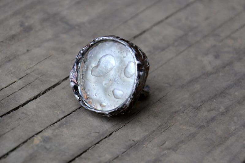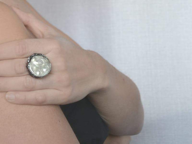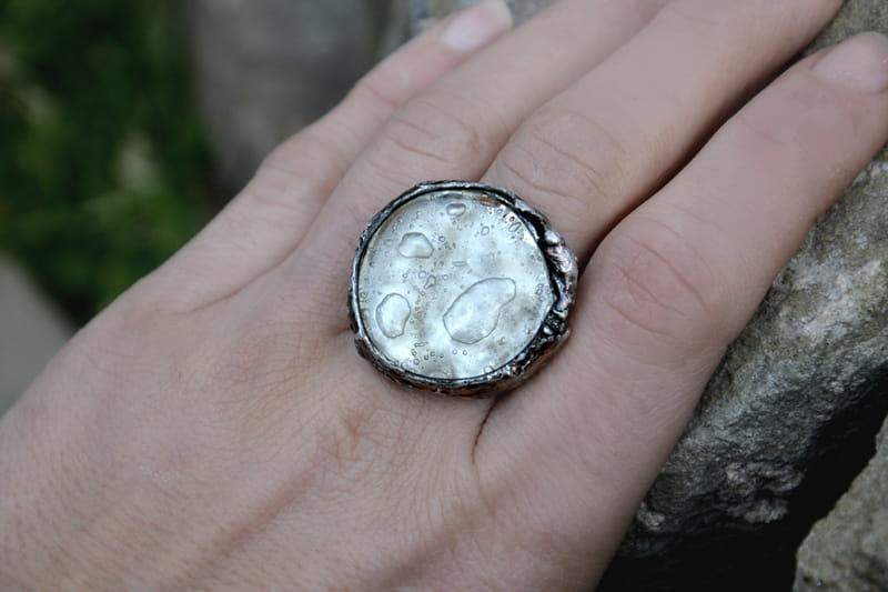 Efektowny pierścień ze szkiełkiem pełnym białych bąbelków. Szkło o średnicy 2,5 cm rustykalnie oprawione w ekologiczną cynę w kolorze starego srebra. Obrączka regulowana. Biżuteria w 100% wykonana ręcznie, poszczególne sztuki mogą się minimalnie różnić.