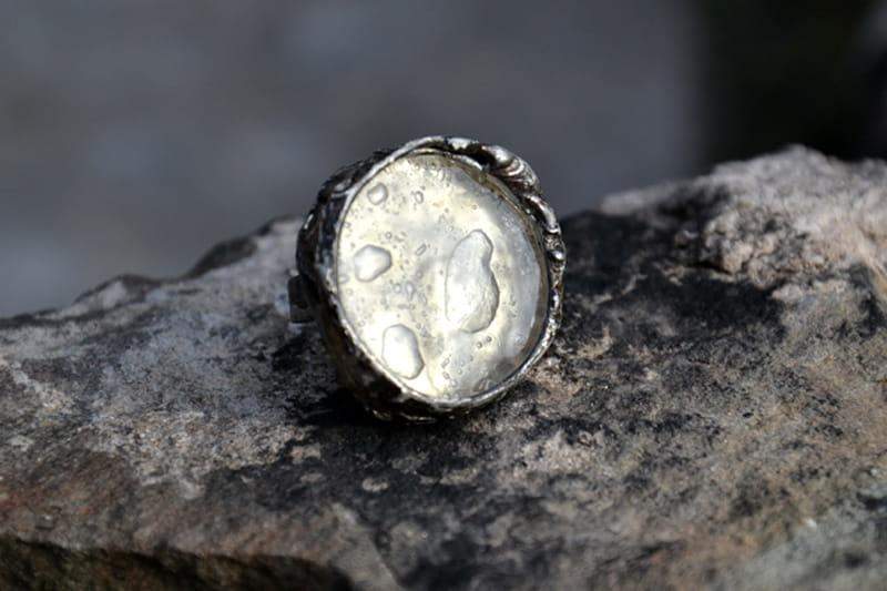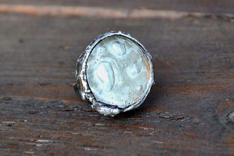 Efektowny pierścień ze szkiełkiem pełnym białych bąbelków.