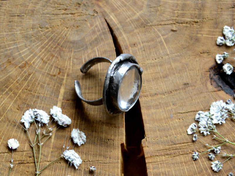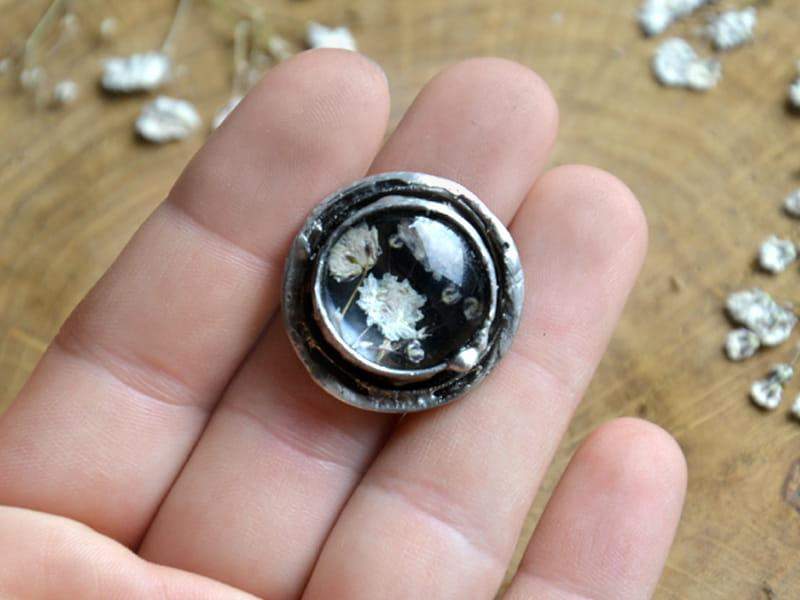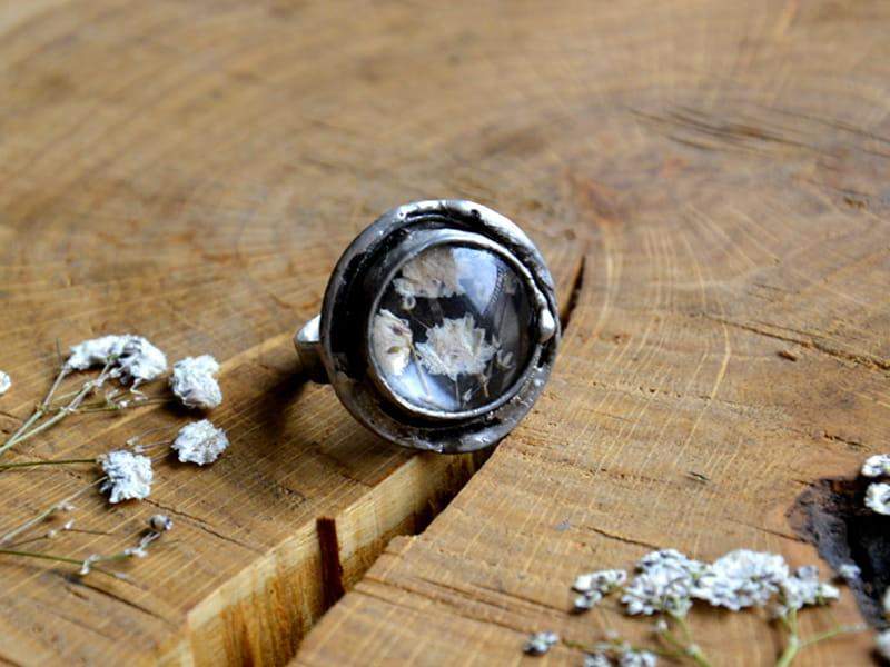 Rustykalny duży pierścionek zamkniętą w szkle gipsówką. Średnica oczka pierścionka to ok. 2,5 cm. Oprawa w odcieniu ciemnego srebra wykonana z ekologicznej cyny. Obrączka regulowana. Biżuteria w 100% wykonana ręcznie, więc poszczególne egzemplarze mogą nieznacznie się między sobą różnić.