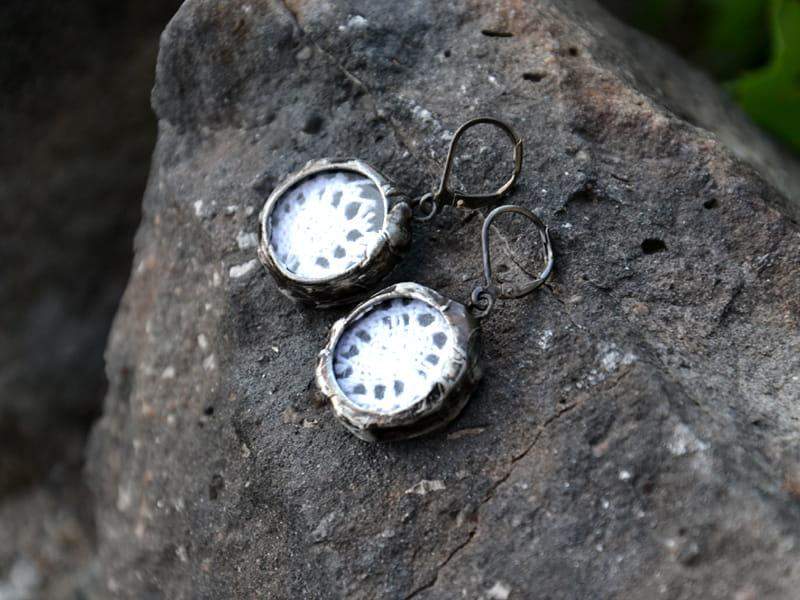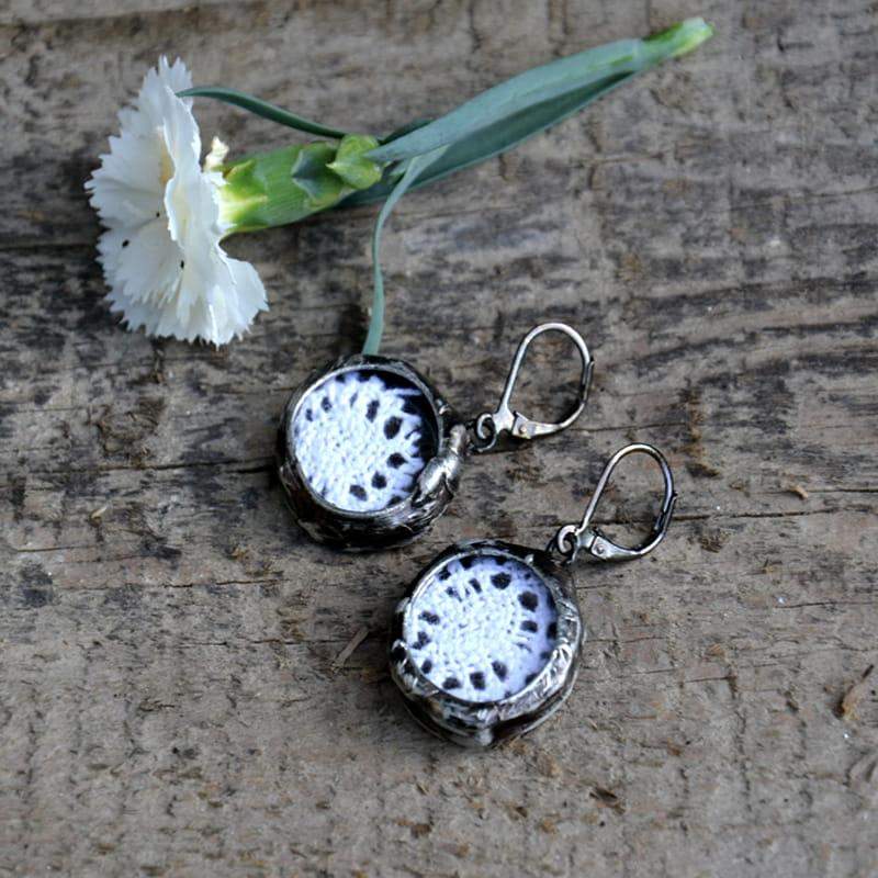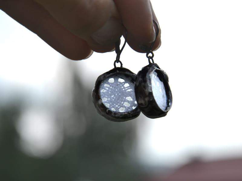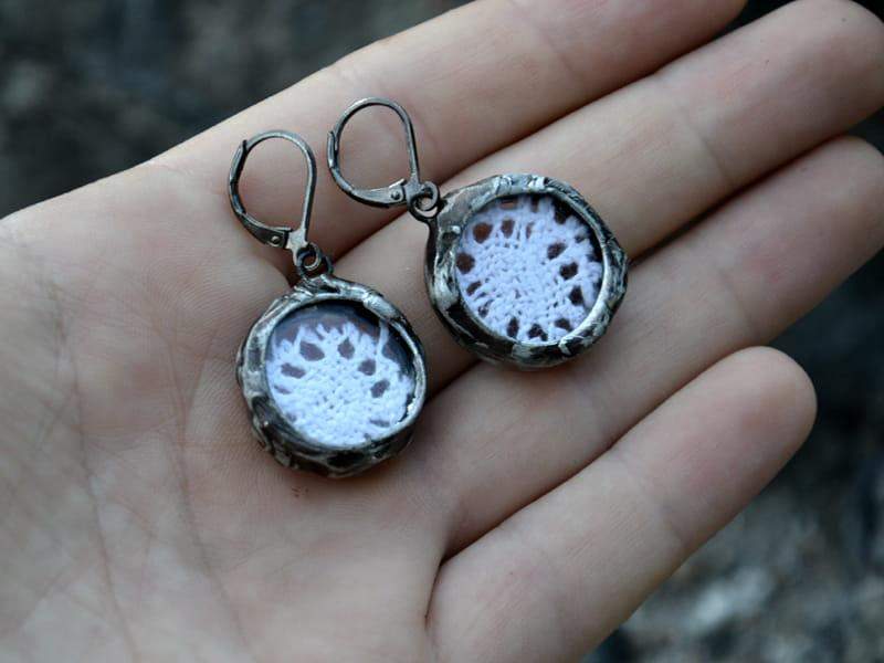 Niezwykle romantyczne kolczyki z zamkniętą w szkle białą koronką. Długość kolczyka to ok. 3,5 cm. Rustykalna oprawa wykonana z ekologicznej cyny stylizowanej na stare srebro. Biżuteria w 100% wykonana ręcznie, poszczególne sztuki mogą się minimalnie różnić.