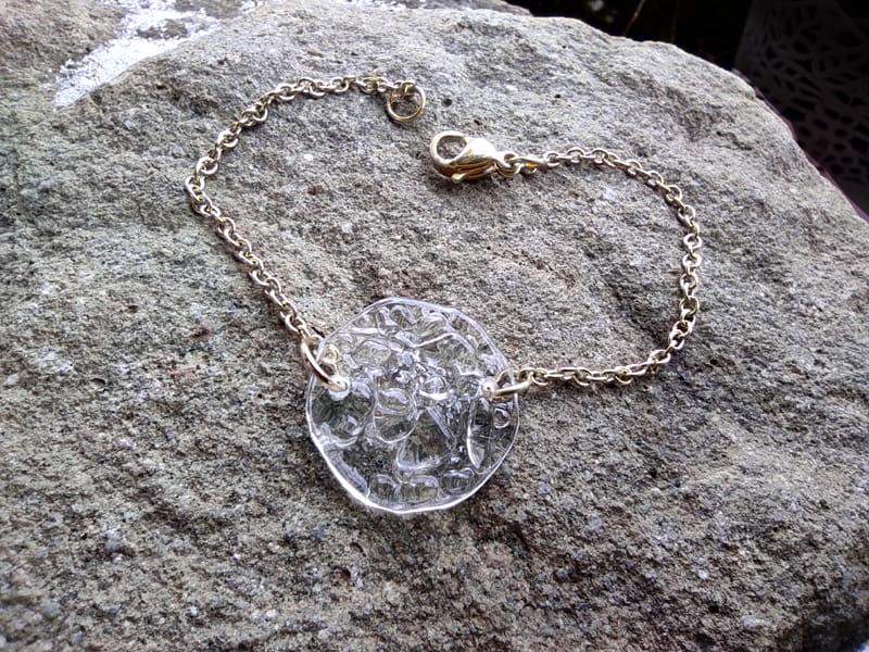 Delikatna, intrygująca bransoletka z uroczym, mieniącym się w świetle szkłem. Średnica szkiełka to ok. 2 cm. Łańcuszek i zapięcie ze stali chirurgicznej w kolorze złotym. Obwód bransoletki to 18 cm. Z przyjemnością wykonam ją w każdym innym rozmiarze.Biżuteria w 100% wykonana ręcznie, poszczególne sztuki mogą się minimalnie różnić.