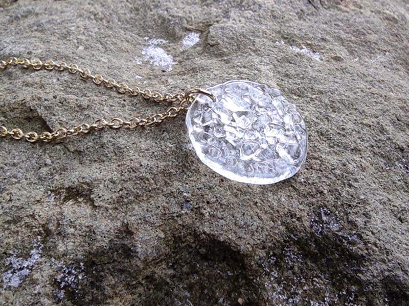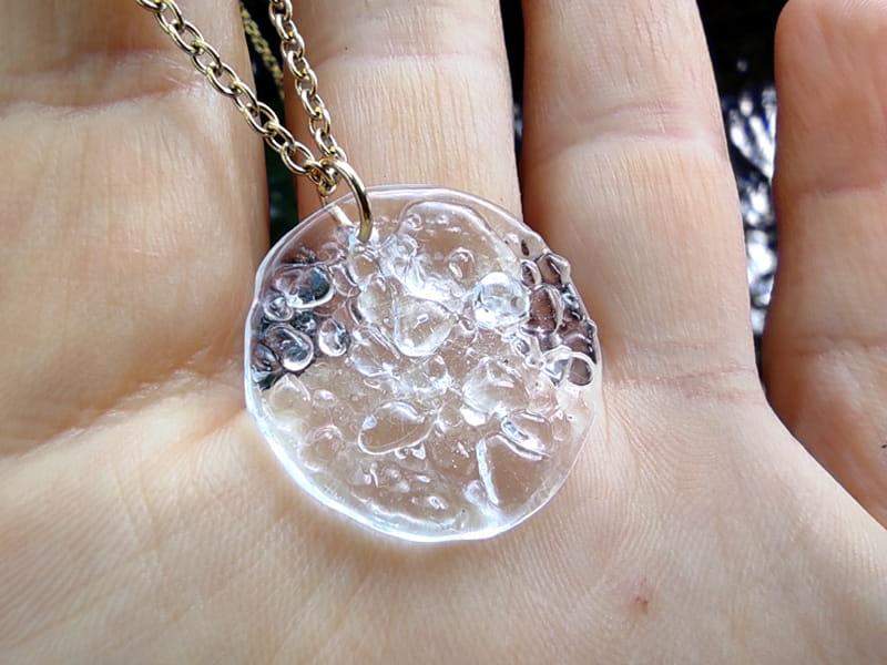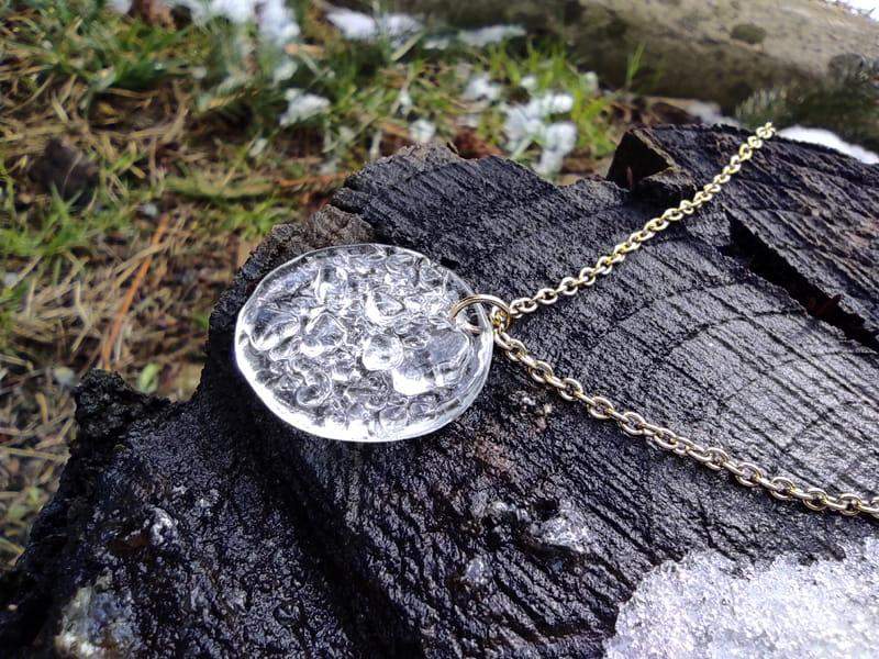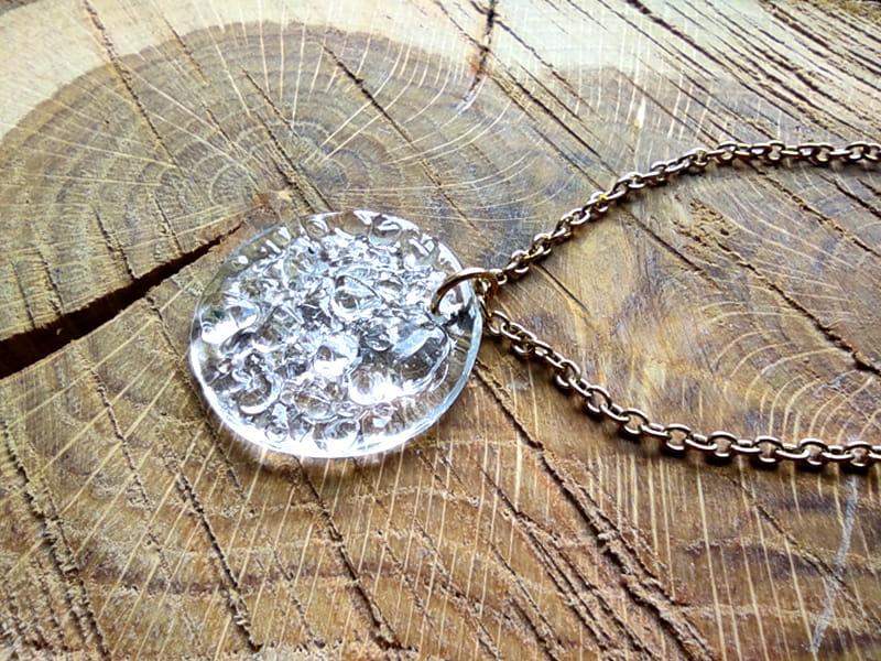 Delikatny, niewielki naszyjnik z uroczym, mieniącym się w świetle szkłem. Średnica szkiełka to ok. 2,5 cm. Łańcuszek i zapięcie ze stali chirurgicznej w kolorze złotym. Długość łańcuszka to 50 cm. Biżuteria w 100% wykonana ręcznie, poszczególne sztuki mogą się minimalnie różnić.