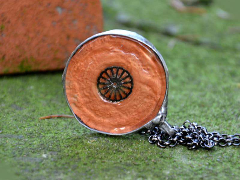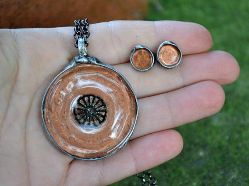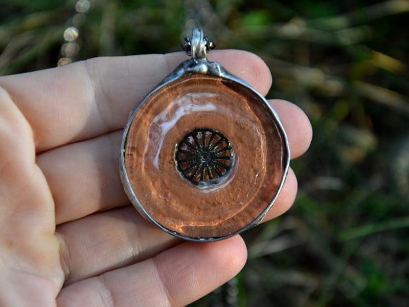 Unikatowy, efektowny wisior ze szkłem. Szkło o średnicy 3,5 cm w połyskującym miedzianym kolorze. Wisior zawieszony na długim łańcuchu. Całość stylizowana na stare srebro. Biżuteria w 100% wykonana ręcznie, poszczególne sztuki mogą się minimalnie różnić.