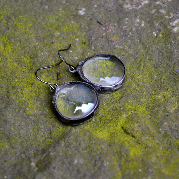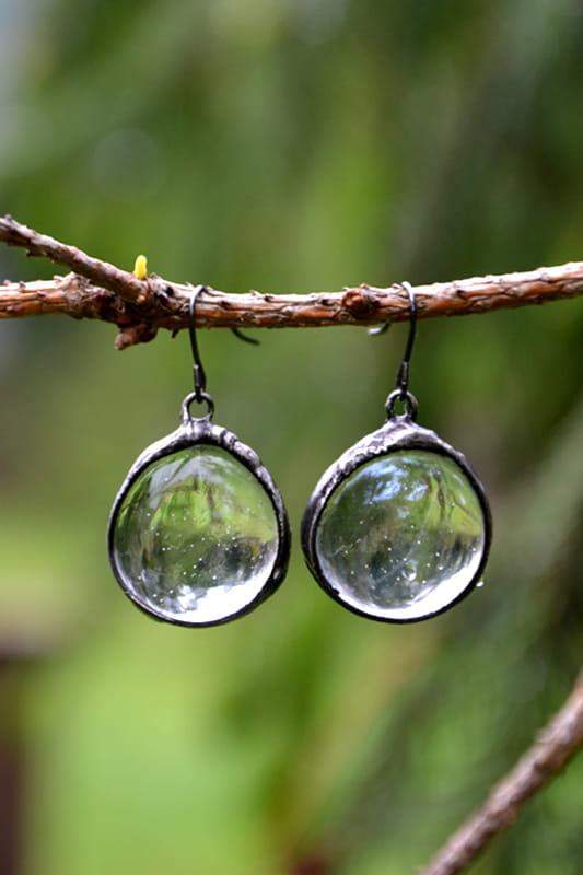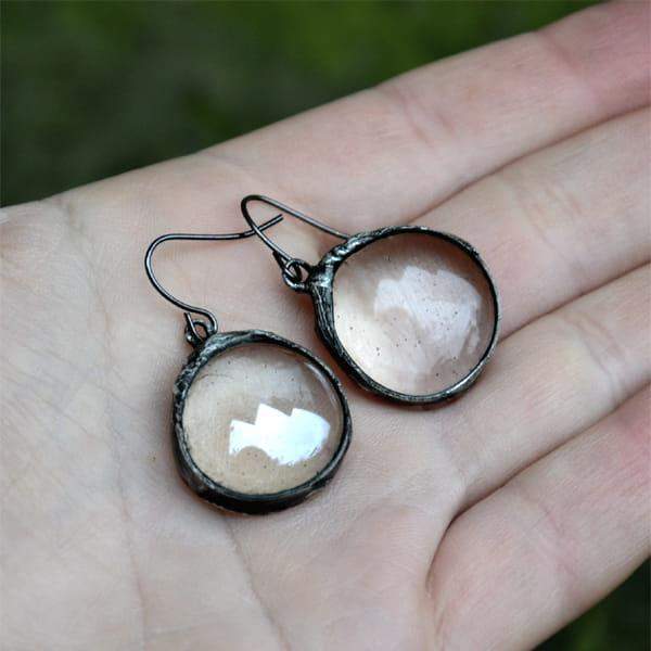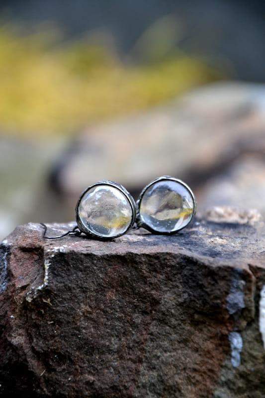 Subtelne, lekkie kolczyki z przeźroczystym szkłem. Oprawa i bigle w kolorze starego srebra. Długość kolczyka to ok. 3,5 cm. Biżuteria w 100% wykonana ręcznie, poszczególne sztuki mogą się minimalnie różnić.