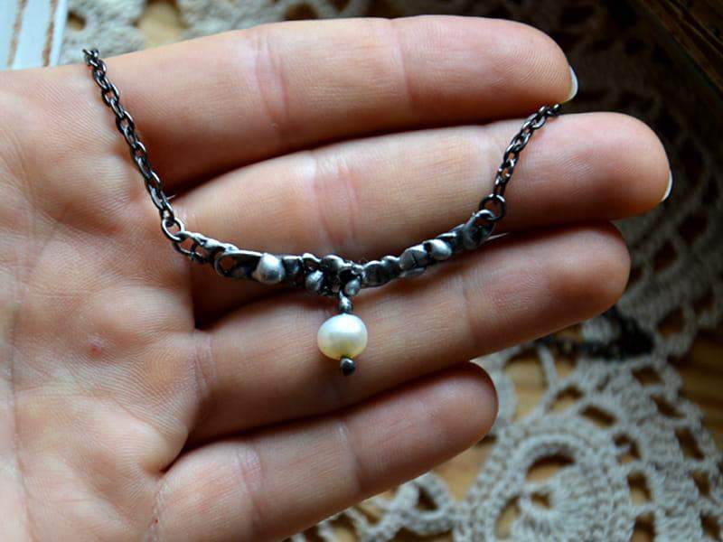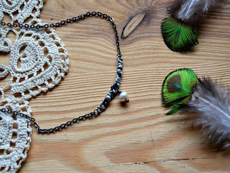 Efektowny, delikatny naszyjnik z perełką. Misterna oprawa wykonana z ekologicznej cyny stylizowanej na ciemne srebro. Obwód naszyjnika to 45 cm plus 3 cm regulacji. Biżuteria w 100% wykonana ręcznie, poszczególne sztuki mogą się minimalnie różnić.