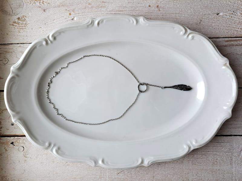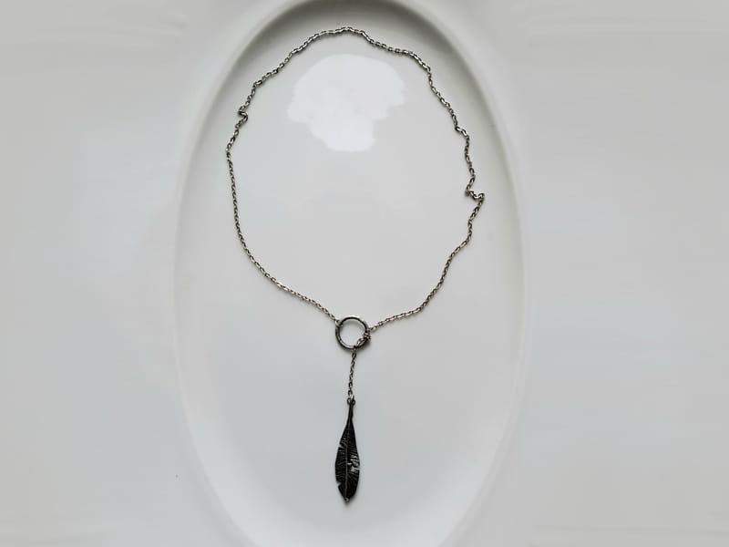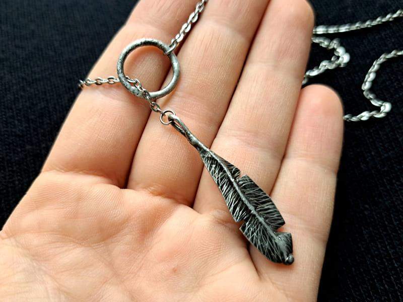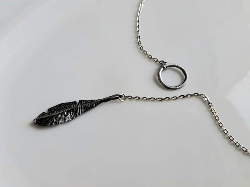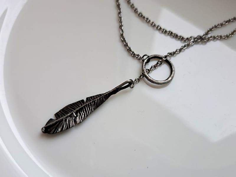 Delikatny naszyjnik w stylu boho z piórkiem w odcieniu ciemnego srebra na łańcuszku ze stali chirurgicznej. Jeśli kochasz oryginalny, nietuzinkowy styl, ten naszyjnik będzie dla Ciebie idealny.