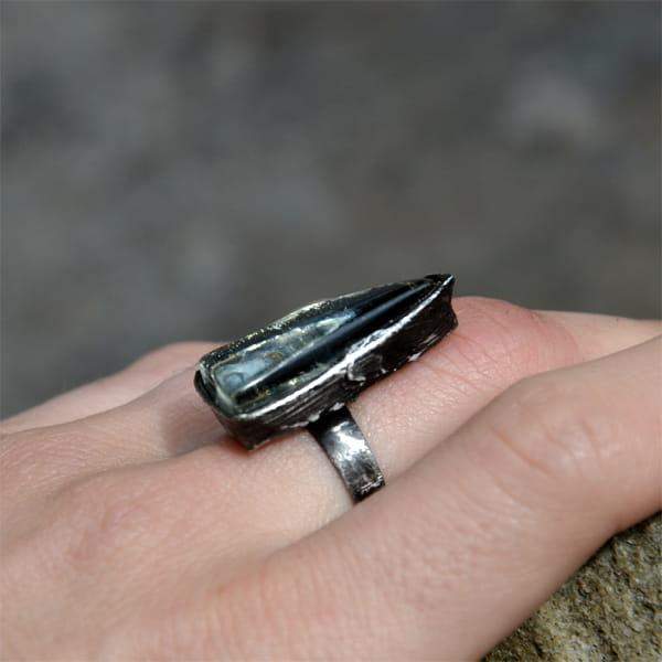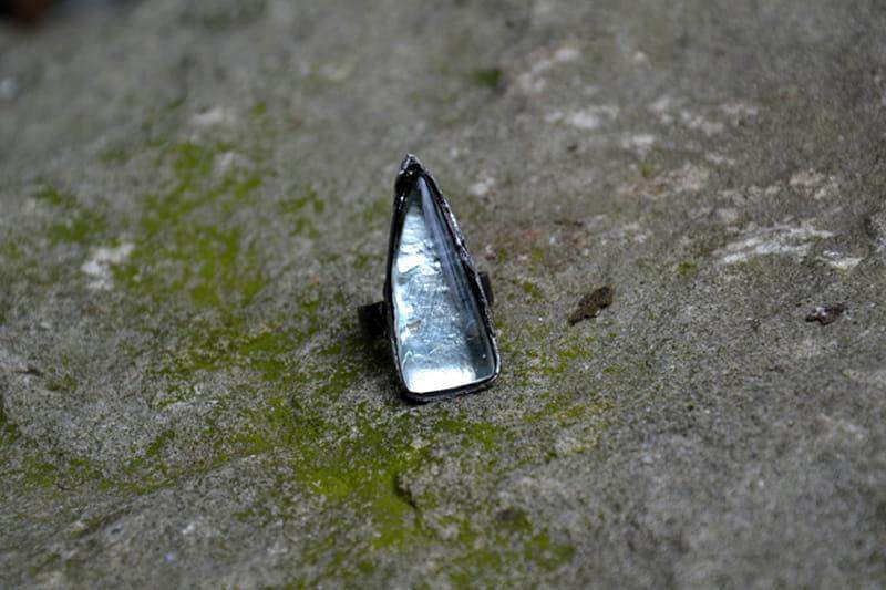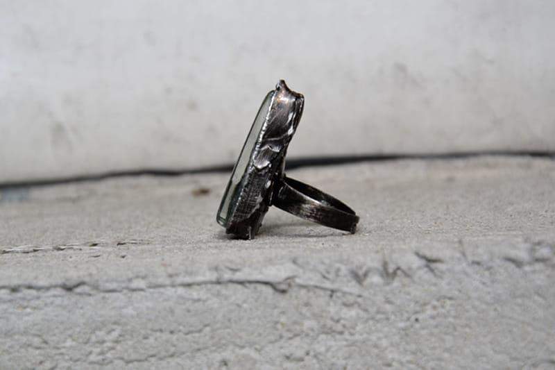 Rustykalny pierścionek ze stapianym przeźroczystym szkłem o wymiarach 1,5 x 3 cm. Surowa oprawa wykonana z miedzi pokrytej ekologiczną cyną stylizowaną na stare srebro. Obrączka regulowana. Biżuteria w 100% wykonana ręcznie, poszczególne sztuki mogą się nieznacznie różnić.