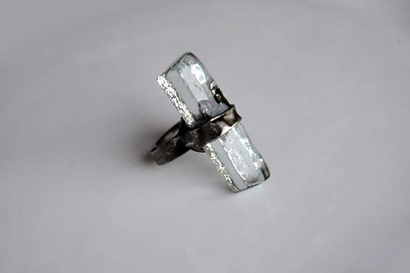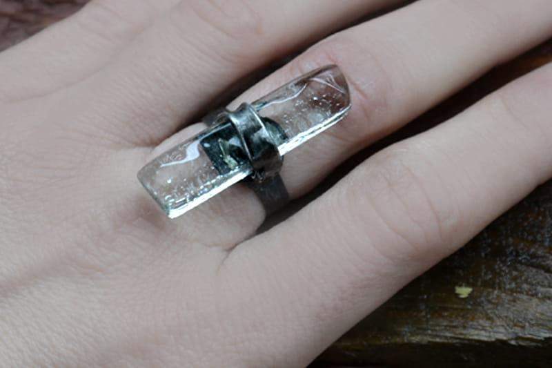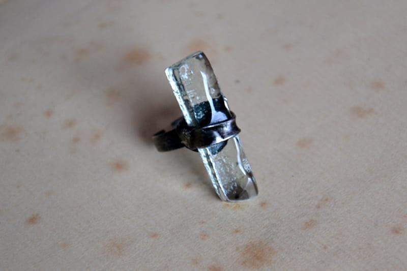 Rustykalny pierścionek ze stapianym przeźroczystym szkłem.