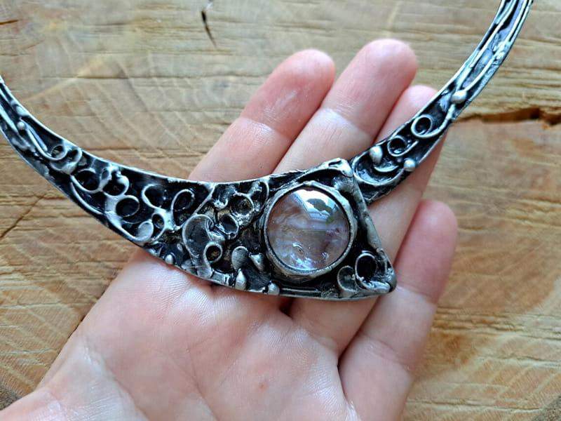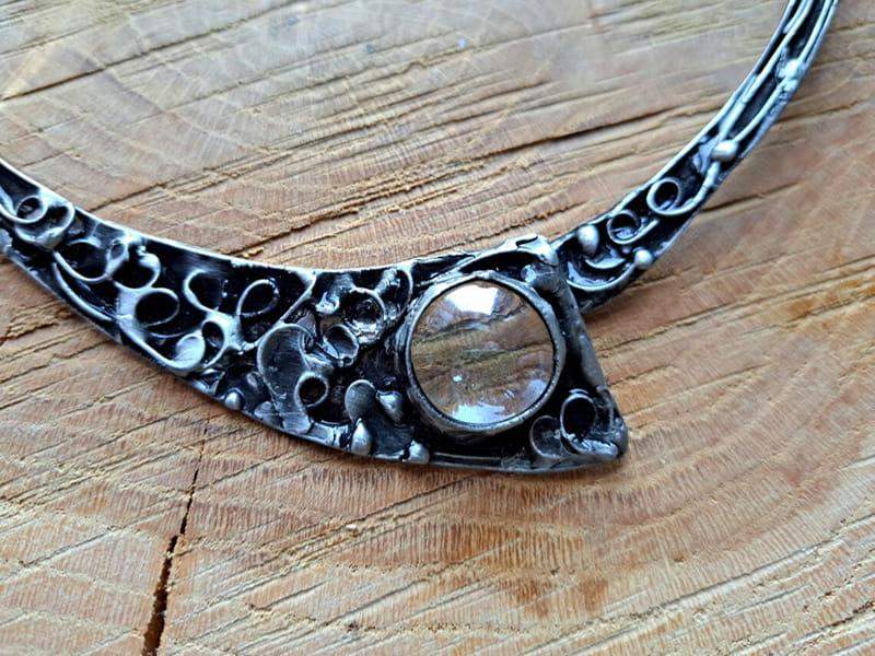 Prosty w formie, sztywny naszyjnik z bogatym, ornamentalnym zdobieniem oraz szkiełkiem.