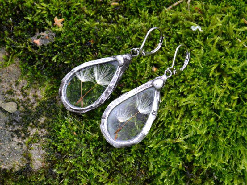 Kolczyki dla romantyczki. W szkle zamknęłam listeczki paproci. Długość kolczyka to ok. 5 cm. Oprawa wykonana z ekologicznej cyny stylizowana na stare srebro. Każdy egzemplarz ze względu na ręczne wykonanie biżuterii nieznacznie różni się między sobą.