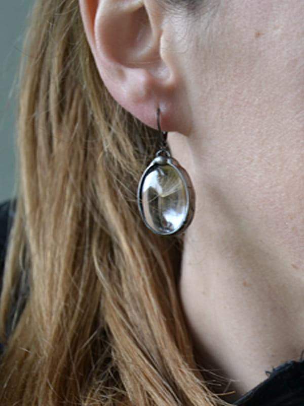 Romantyczne kolczyki z nasionami dmuchawca zamkniętymi w szkle. Oprawa wykonana z ekologicznej cyny stylizowanej na stare srebro. Zamykane antyalergiczne bigle. Długość kolczyka to ok. 4,5 cm