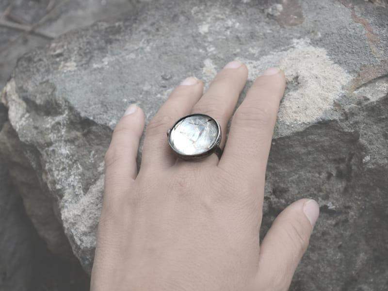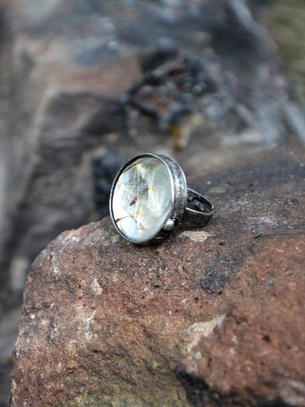 Idealny dodatek dla romantyczki. Pierścionek z zamkniętymi w szkle nasionami dmuchawca. Średnica oczka pierścionka to ok. 2,5 cm. Oprawa w kolorze starego srebra wykonana z ekologicznej cyny. Obrączka regulowana. Biżuteria w 100% wykonana ręcznie, więc poszczególne egzemplarze mogą nieznacznie się między sobą różnić.
