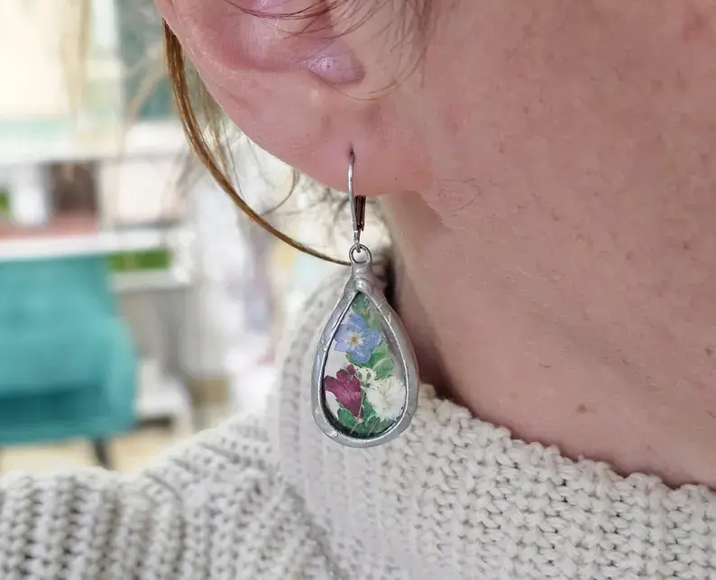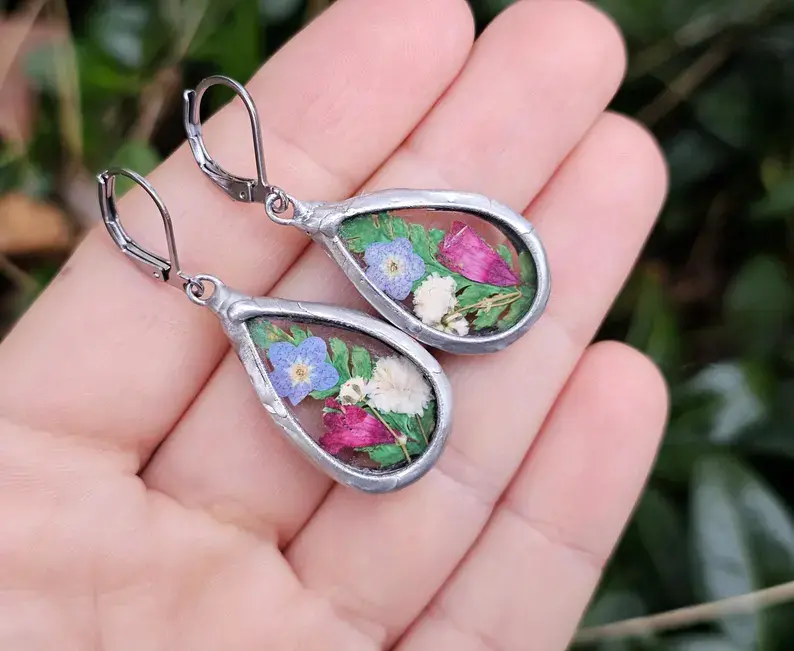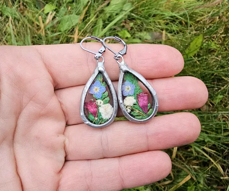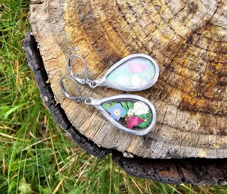 Efektowne, dekoracyjne kolczyki z wiosennymi kwiatami zamkniętym w szkle w kształcie kropli Zasuszone własnoręcznie kwiaty zamknięte w szkiełkach w kształcie kropli.