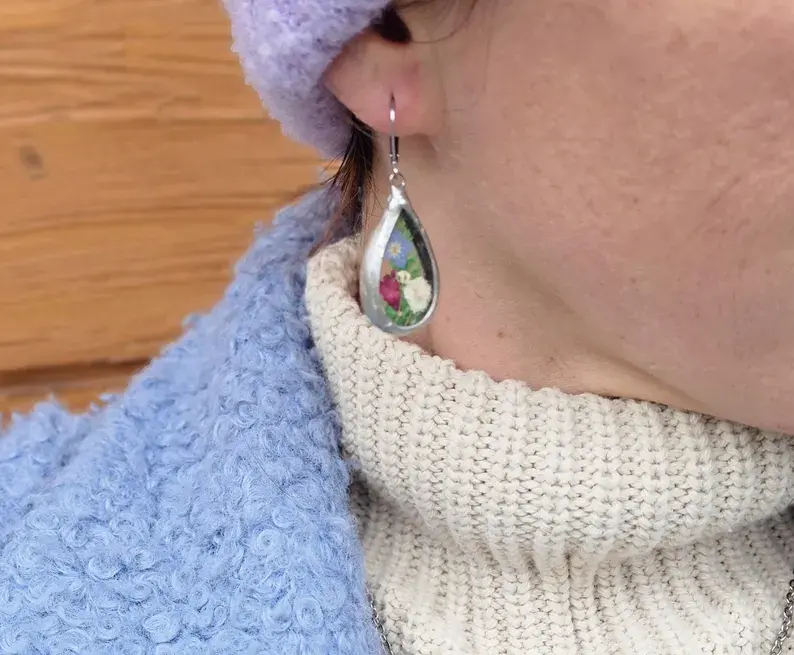 Unikalne kolczyki z wiosennymi kwiatami w kształcie kropli.