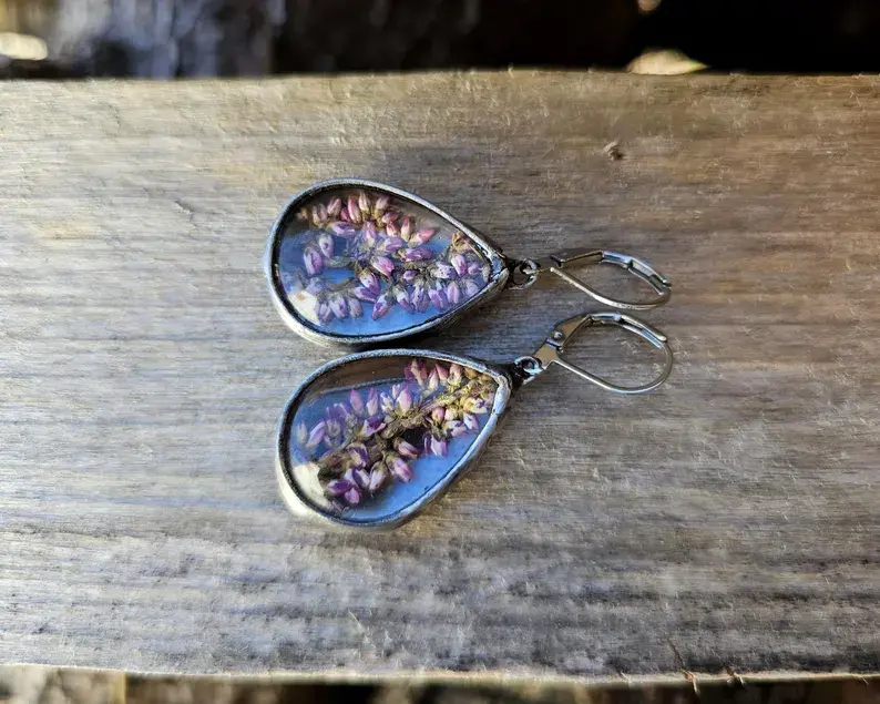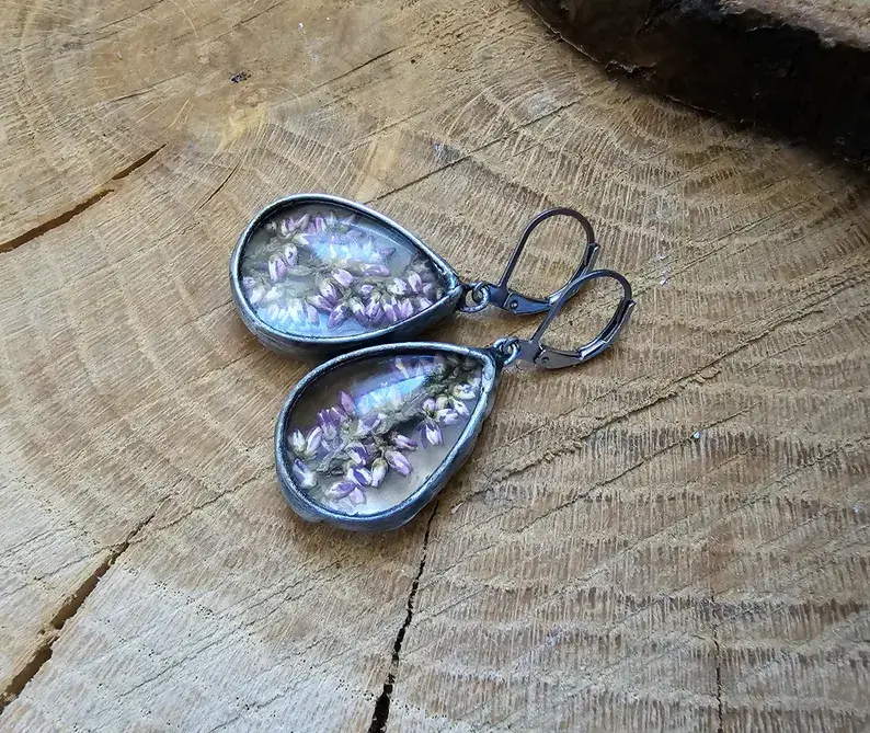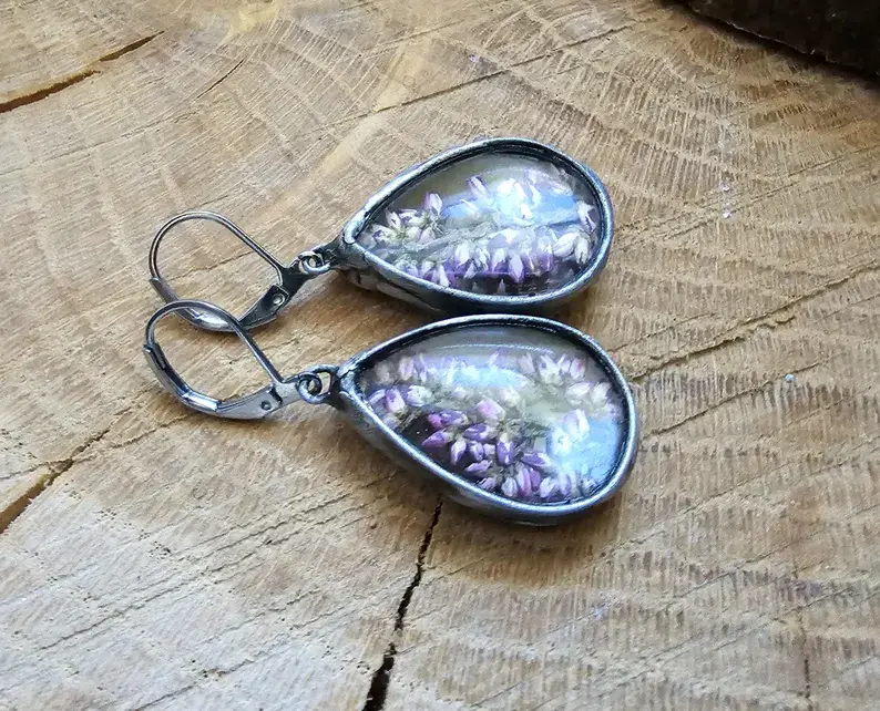 Efektowne, dekoracyjne kolczyki z wrzosem zamkniętym w szkle w kształcie kropli Zasuszone własnoręcznie gałązki wrzosu zamknięte w szkiełkach w kształcie kropli.