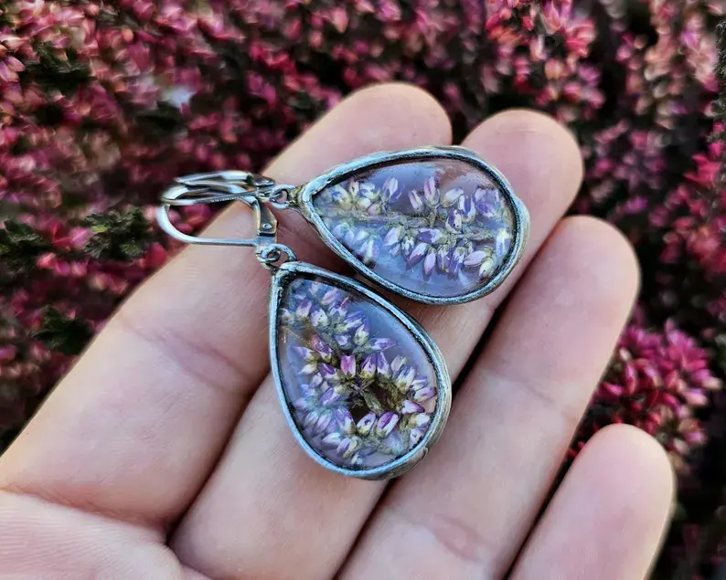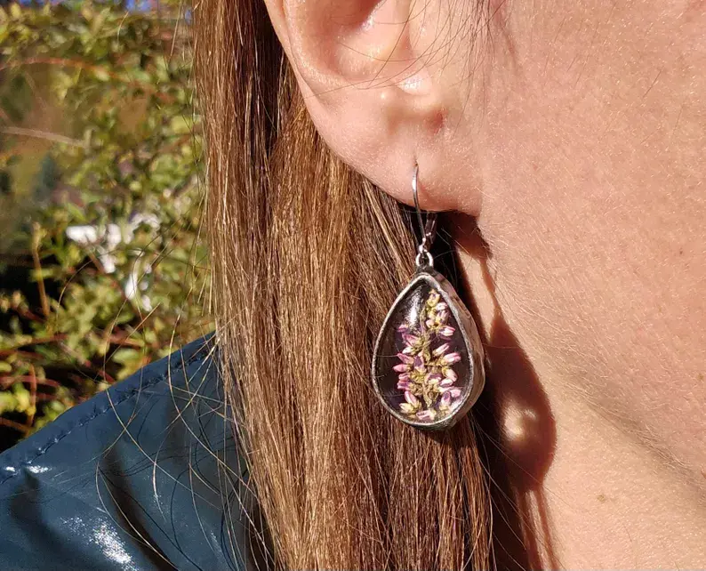 Unikalne kolczyki z wrzosem w kształcie kropli