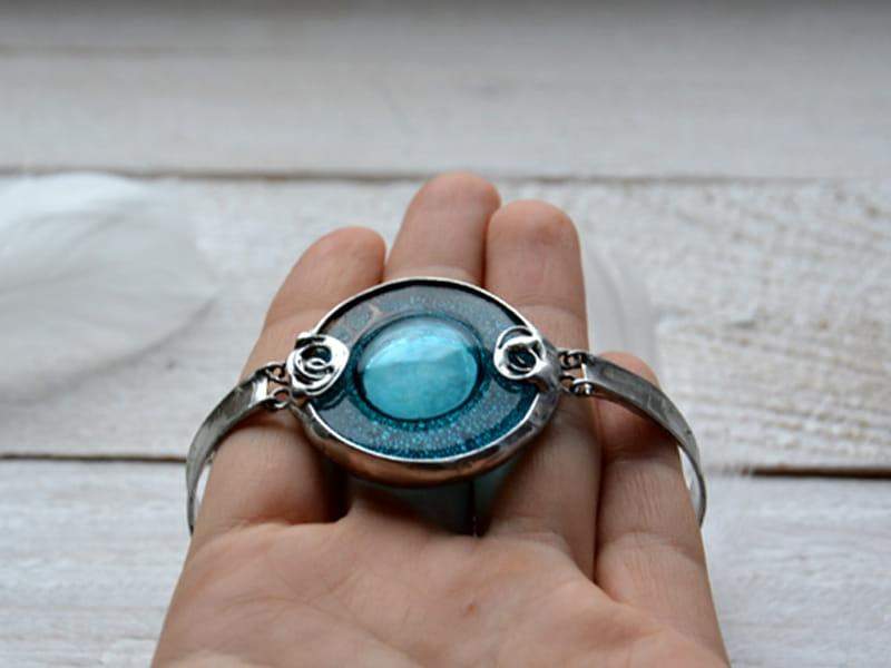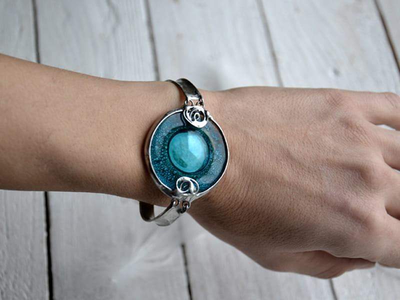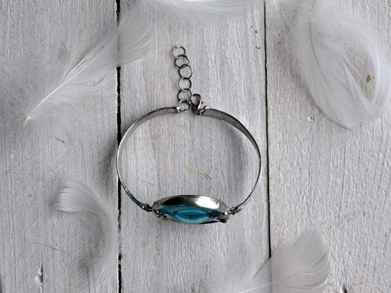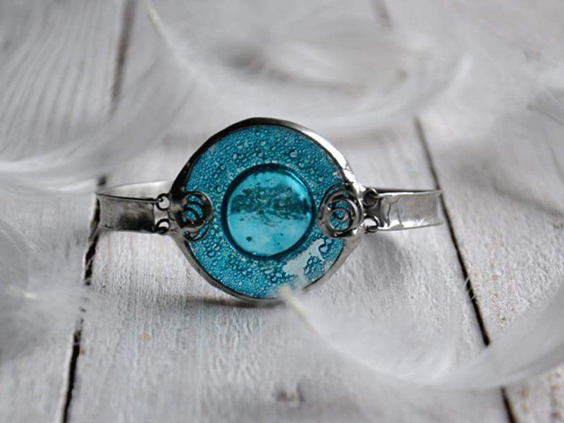 Niezwykła bransoletka w pięknym kolorze. Wytopione przeze mnie szkiełko o średnicy 3,5 cm oprawione jest w ekologiczną cynę w kolorze srebrnym. Obwód bransoletki to 17 cm + 2 cm regulacji. Z przyjemnością dopasuję rozmiar do Twojej ręki. Zapraszam!
