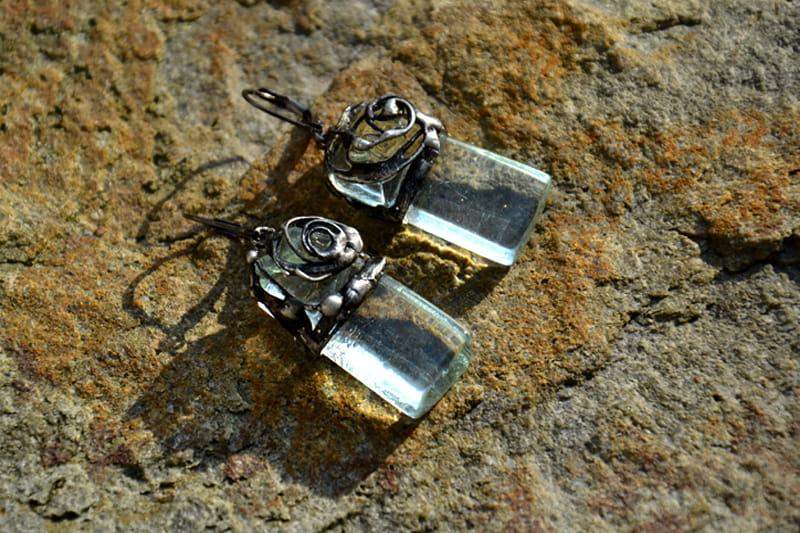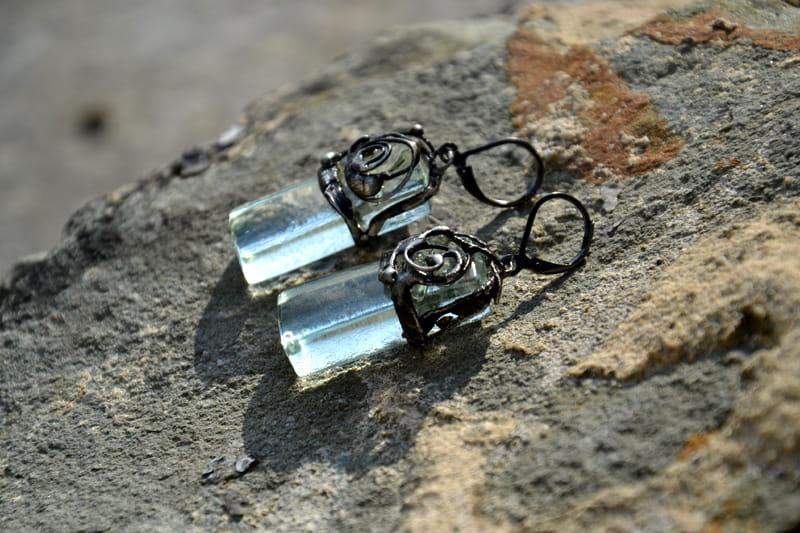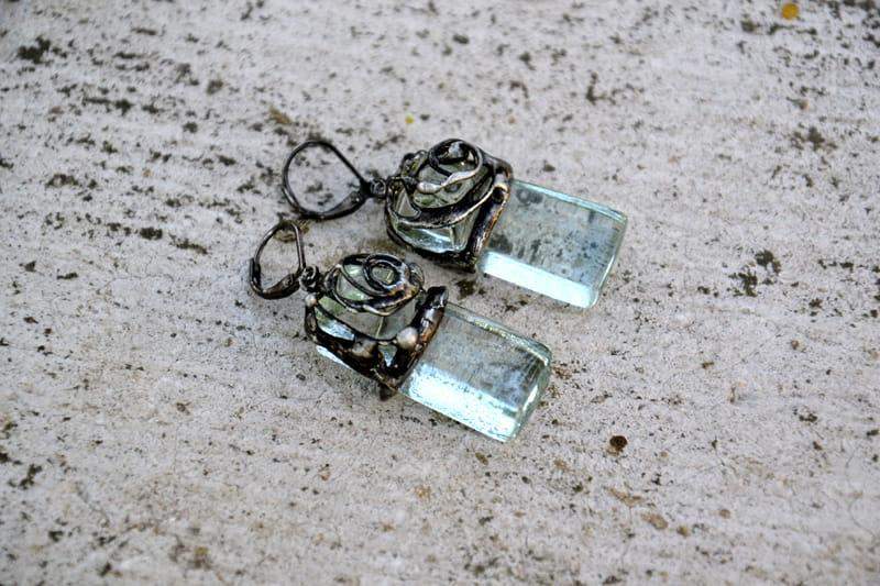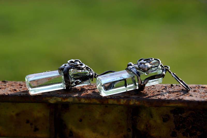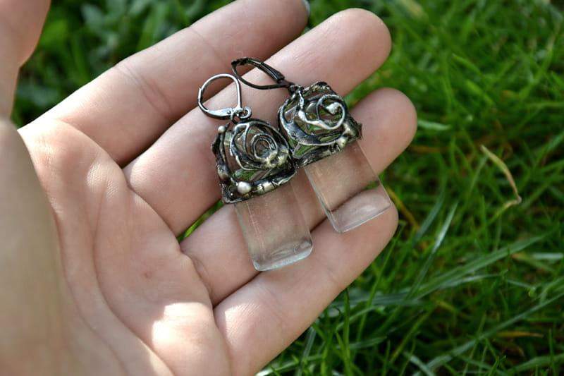 Romantyczne kolczyki. Przeźroczyste, wypalone przeze mnie szkło ozdobnie oprawiłam w ekologiczną, stylizowaną na stare srebro cynę. Długość kolczyka to ok. 4,5 cm. Biżuteria w 100% wykonana ręcznie, poszczególne sztuki mogą się minimalnie różnić.