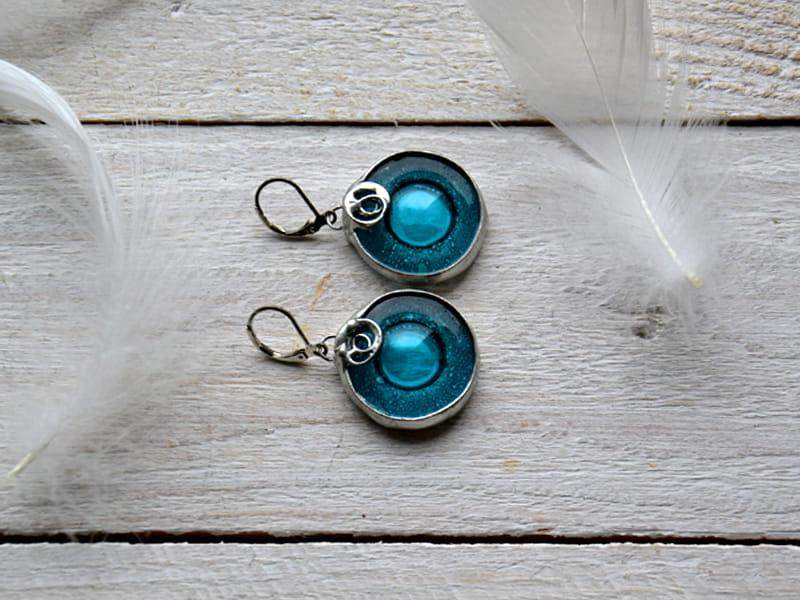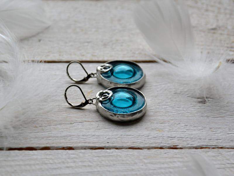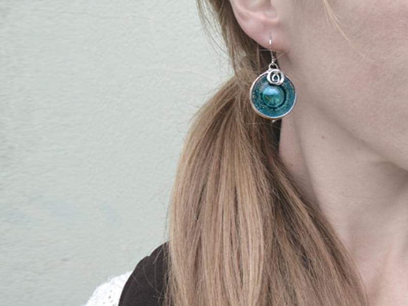 Niezwykłe kolczyki w pięknym kolorze. Wytopione przeze mnie szkiełka o średnicy 2,5 cm oprawione jest w ekologiczną cynę w kolorze srebrnym. Zamykane bigle są antyalergiczne. Z przyjemnością dopasuję rozmiar kolczyków do Twoich potrzeb. Zapraszam!