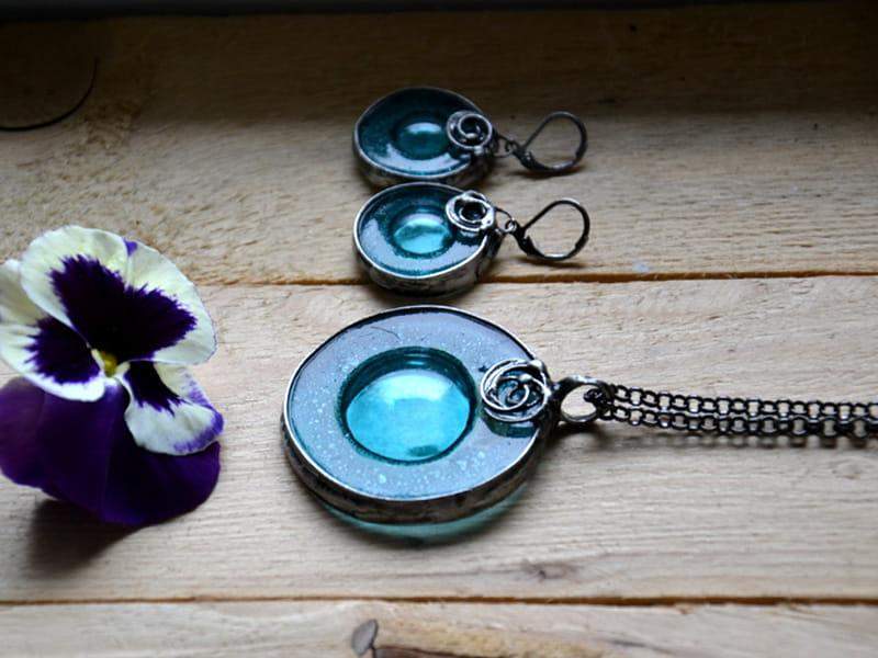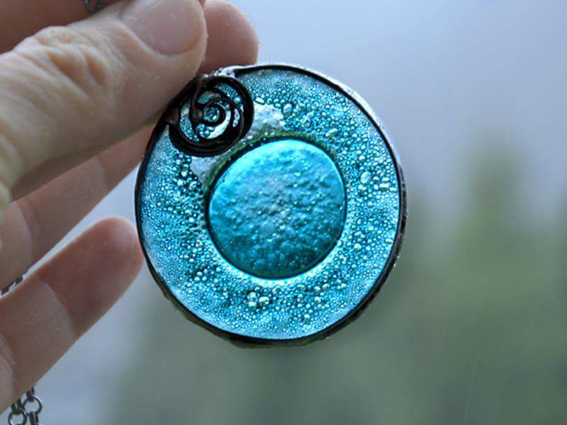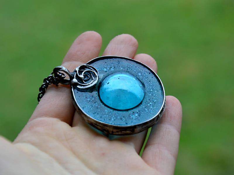 Niezwykły, efektowny wisior ze szkłem. Szkło z mnóstwem turkusowych bąbelków w środku. Średnica wisiora ok. 5 cm. Szkło misternie oprawione w cynę stylizowaną na stare srebro. Wisior zawieszony na długim łańcuchu