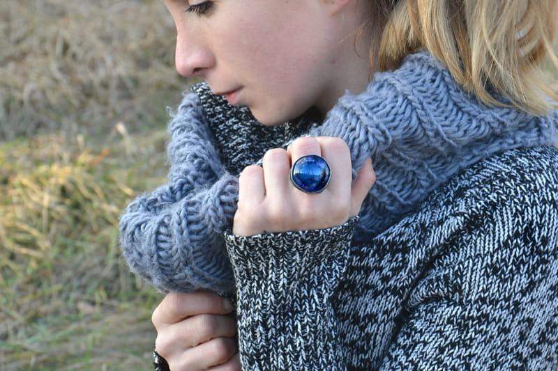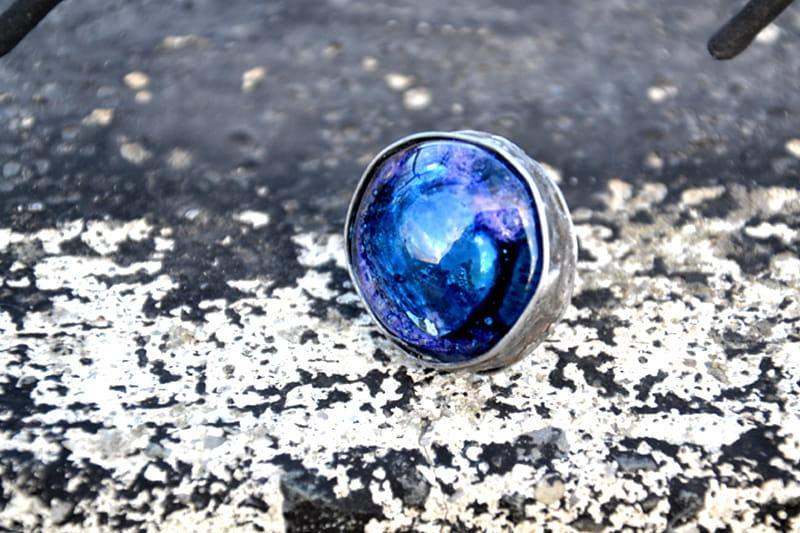 Unikatowy pierścionek z wytopionym przeze mnie szkłem w ciekawym kolorze. Szkiełko o średnicy ok. 2,5 cm oprawione w cynę stylizowaną na stare srebro. Obrączka regulowana. Biżuteria w 100% wykonana ręcznie, poszczególne egzemplarze mogą się minimalnie różnić.