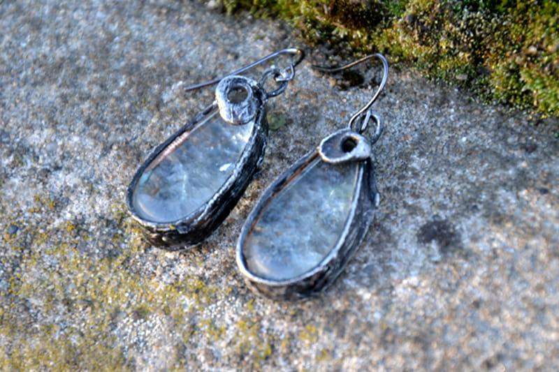 Niepowtarzalne kolczyki ze szkłem. Oprawa z ekologicznej cyny w kolorze starego srebra nadaje kolczykom uroku. Długość całego kolczyka to ok. 4,5 cm. Biżuteria w 100% wykonana ręcznie, poszczególne sztuki mogą się minimalnie różnić.