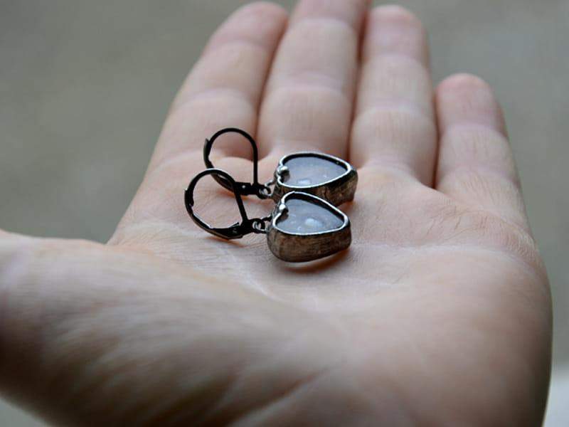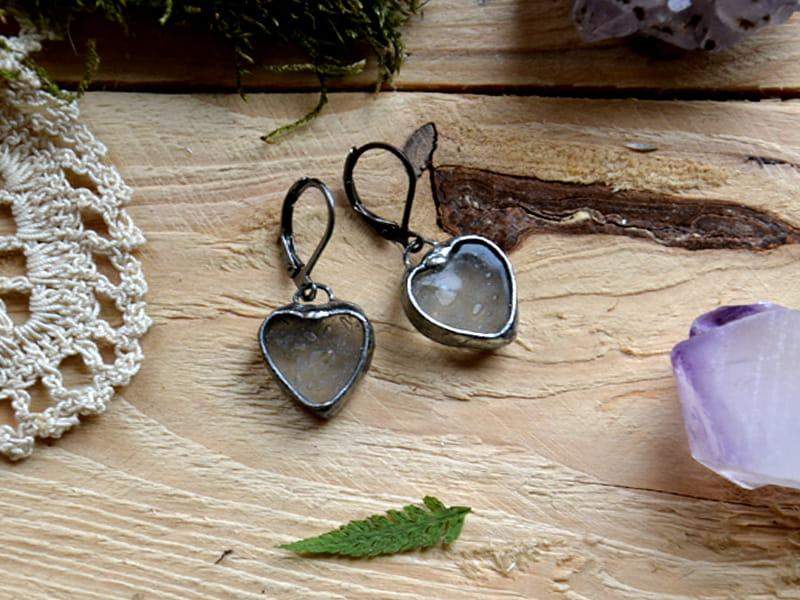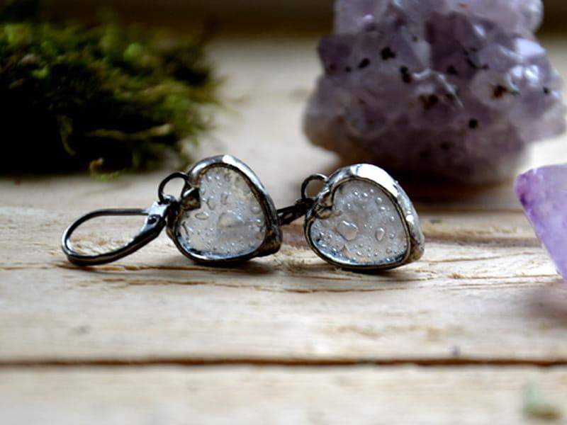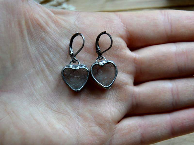 Subtelne, romantyczne, lekkie kolczyki serduszka. Szkło wypalone przez mnie, z zatopionymi białymi bąbelkami. Oprawa i bigle stylizowane na stare srebro. Długość kolczyka to ok. 3 cm. Biżuteria w 100% wykonana ręcznie, poszczególne sztuki mogą się minimalnie różnić.