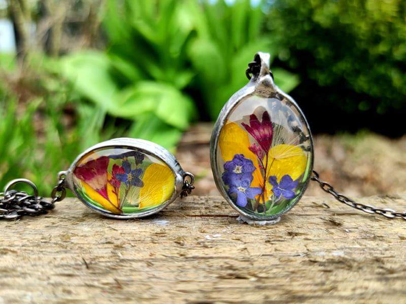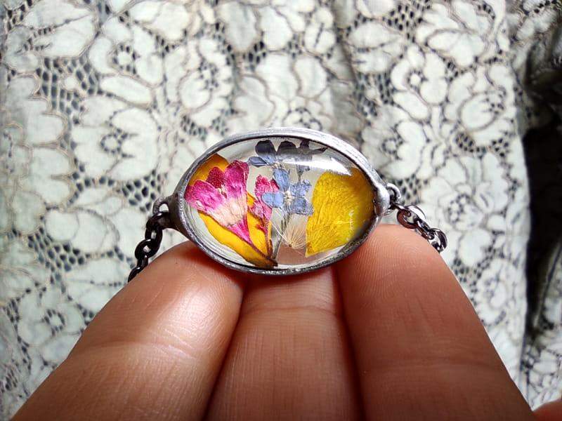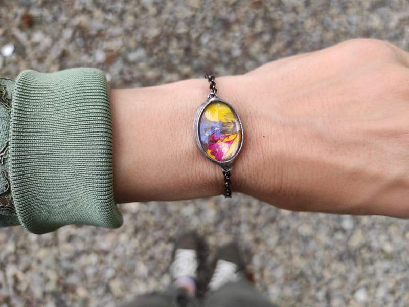 Kolorowa bransoletka z zamkniętymi w szkle wiosennymi kwiatami.