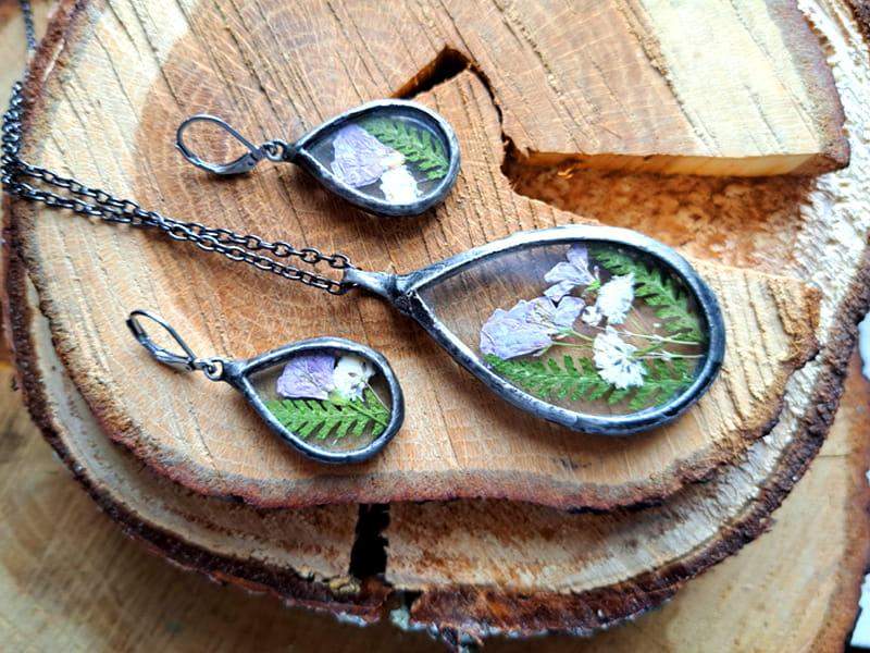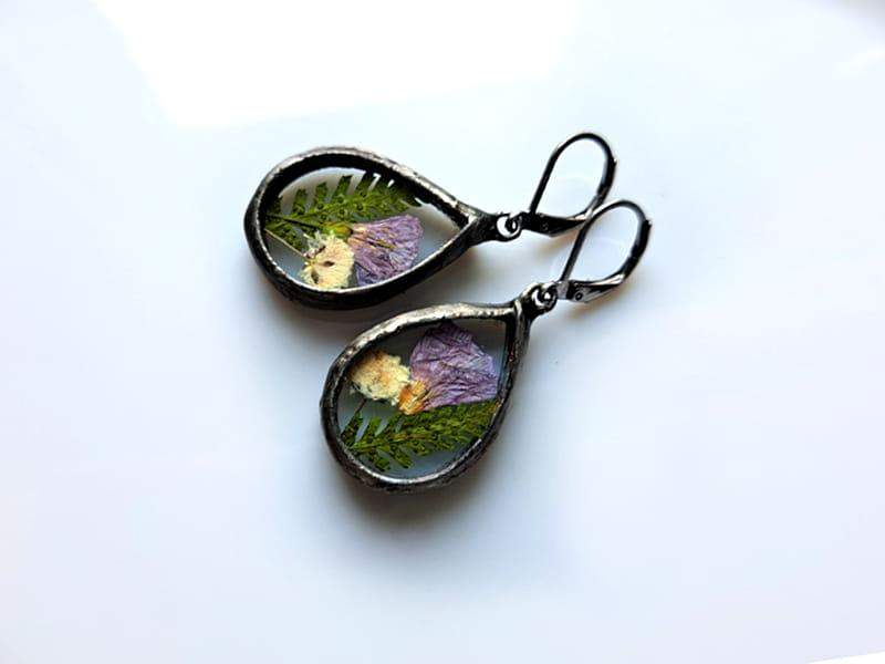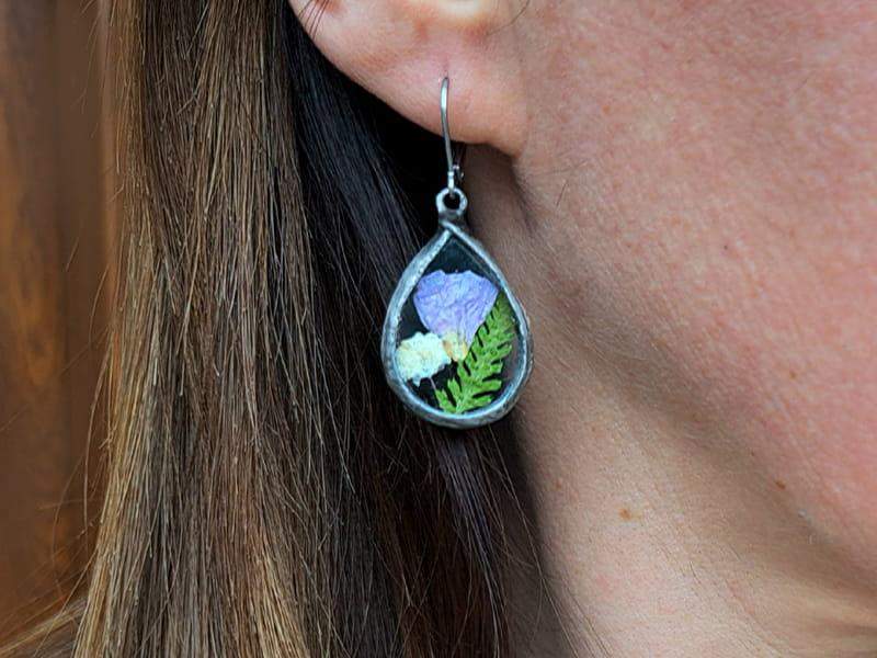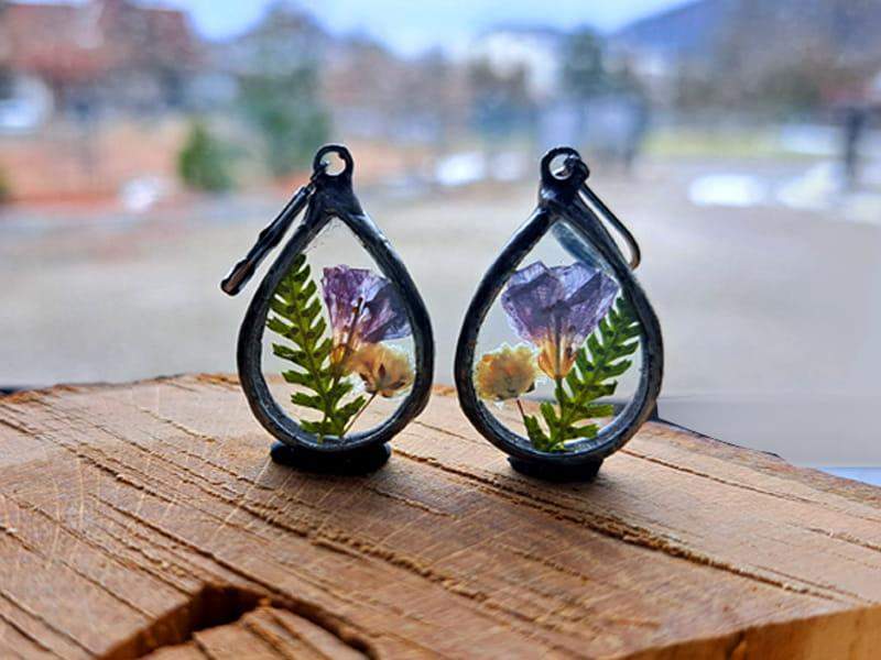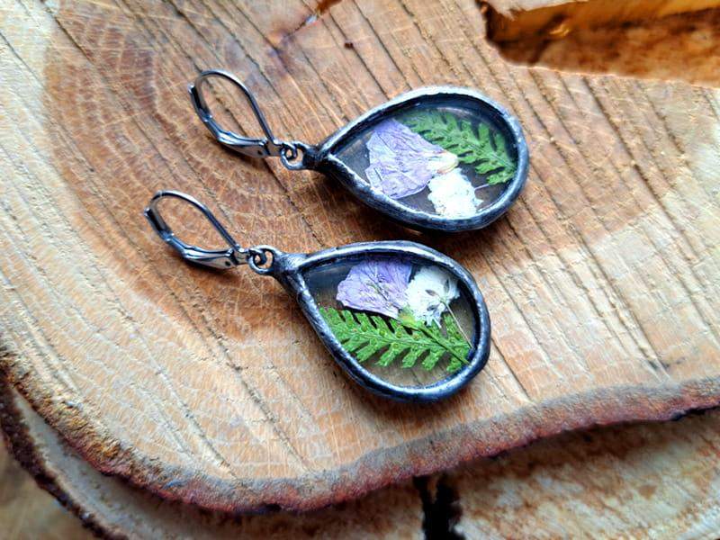 Roślinne kolczyki z dzwoneczkami, paprocią i gipsówką zamkniętymi w szkle.